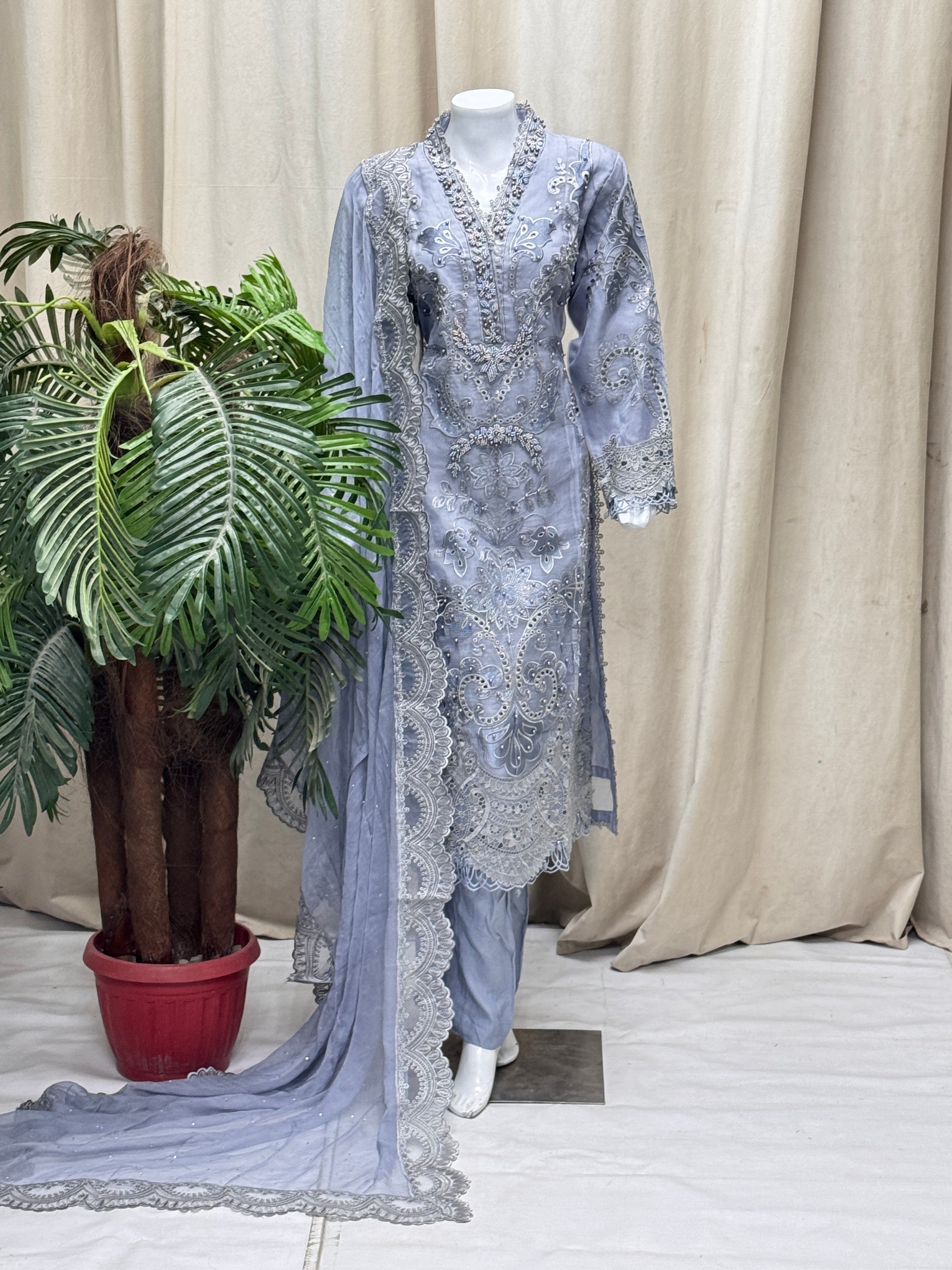 An organza shirt beautifully detailed with pearl lace, chikankari patterns, and fine embroidery creates an elegant and refined charm. Paired with a plain grip trouser for a sleek balance, the look is completed with a chiffon dupatta finished with four-sided lace for a delicate touch.
