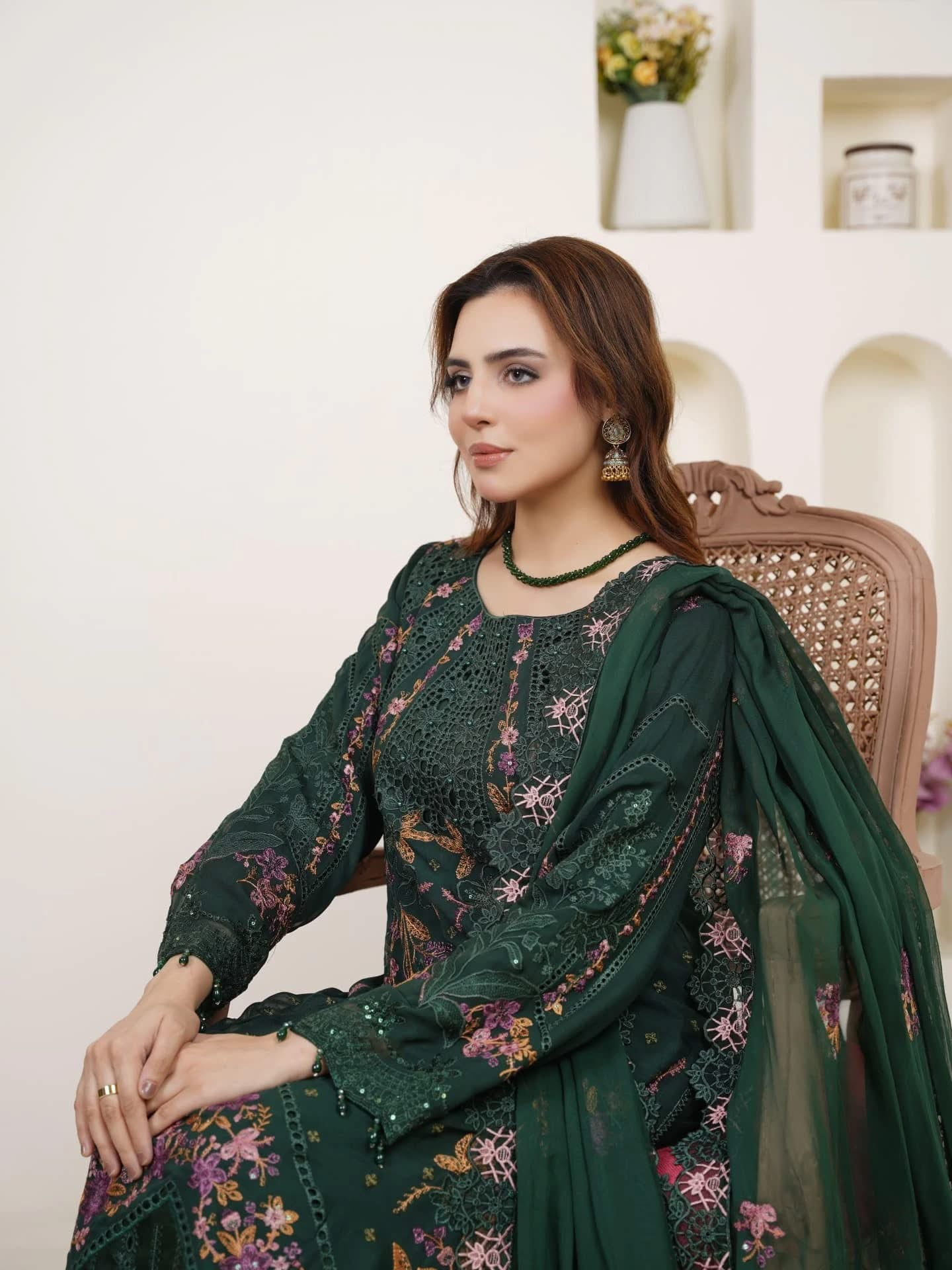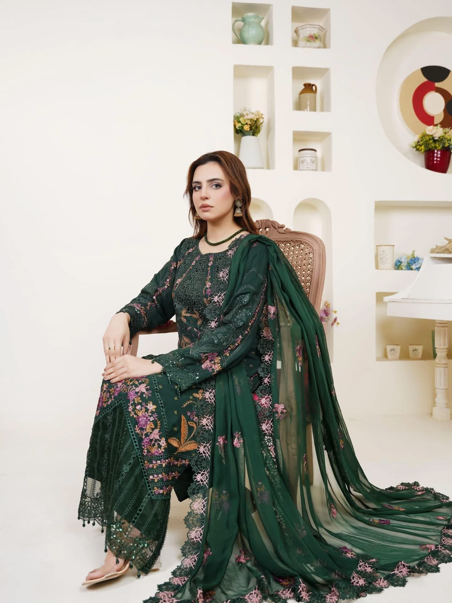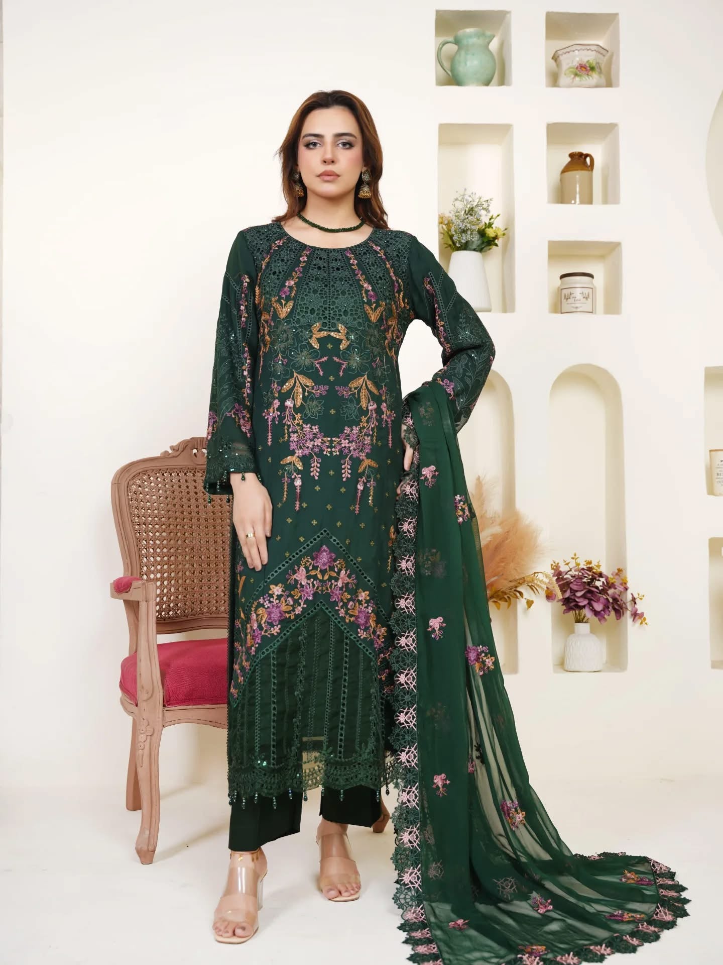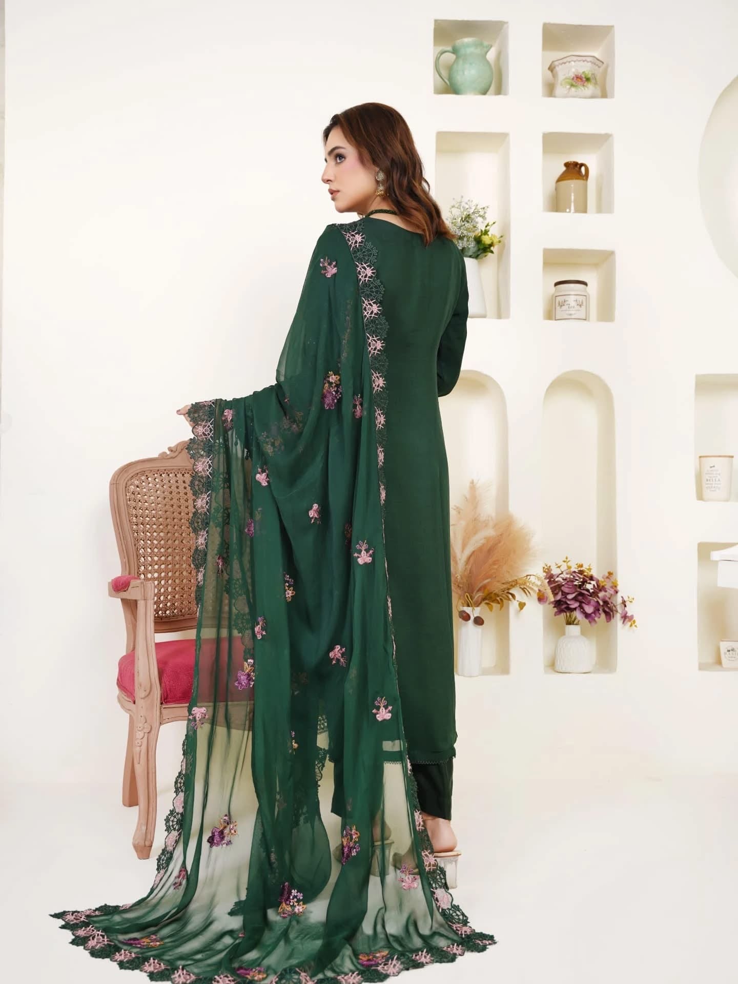 A chiffon shirt beautifully detailed with thread and sequin embroidery, enhanced with delicate chicken kari work and tassels attached at the bottom for a stylish finish. Paired with sleek grip trousers for a refined look and a chiffon dupatta featuring a four-sided patchwork border, this ensemble blends tradition with elegance.