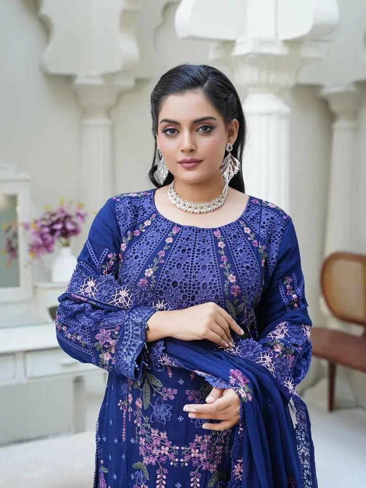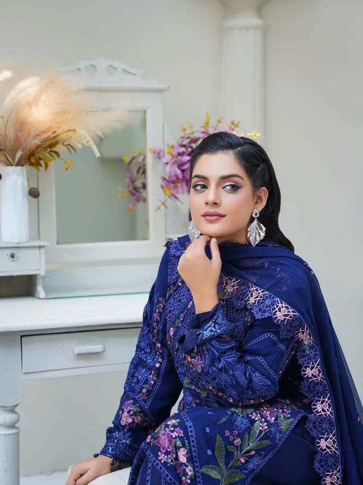 A chiffon shirt beautifully detailed with thread and sequin embroidery, enhanced with delicate chicken kari work and tassels attached at the bottom for a stylish finish. Paired with sleek grip trousers for a refined look and a chiffon dupatta featuring a four-sided patchwork border, this ensemble blends tradition with elegance.