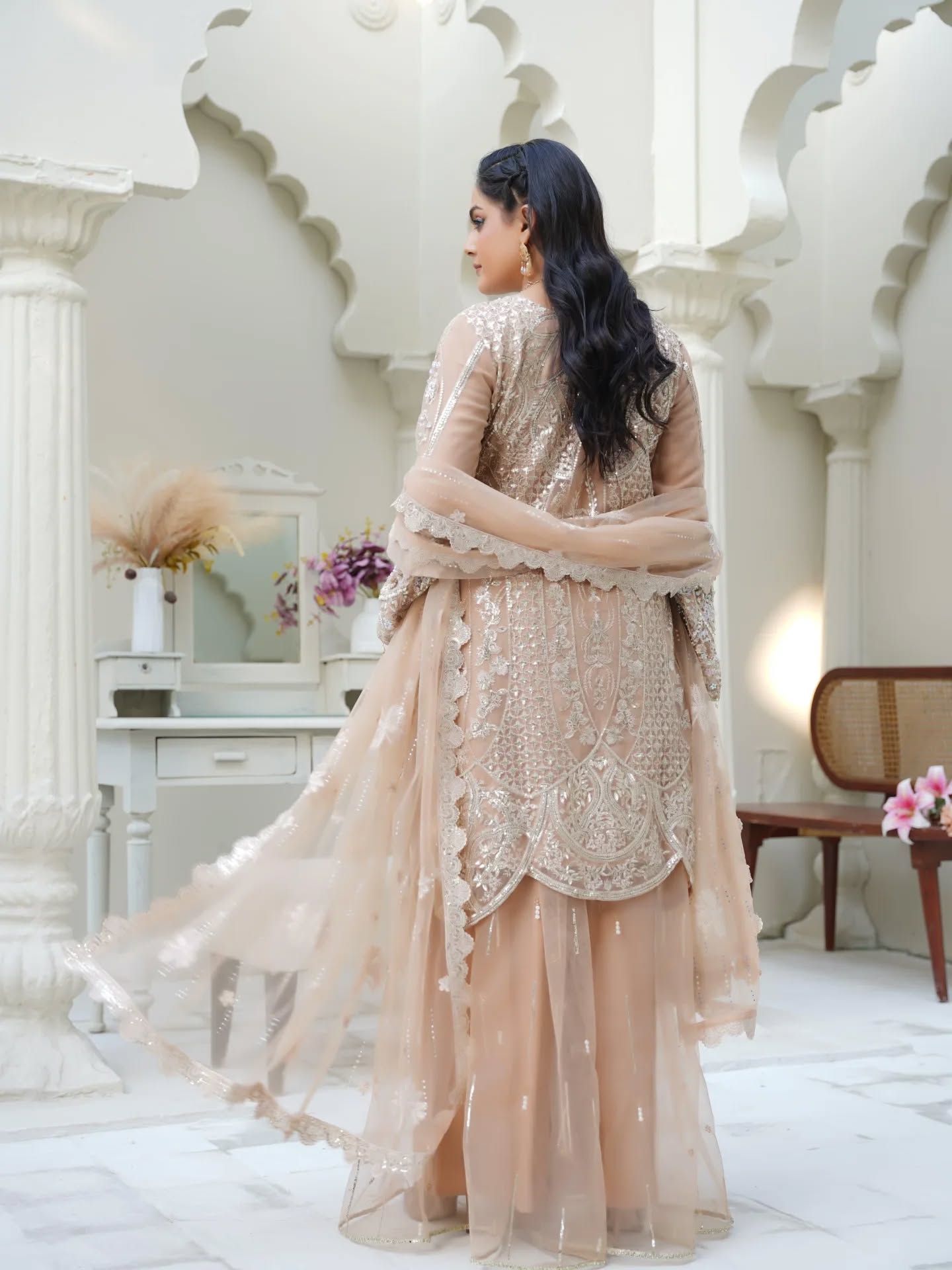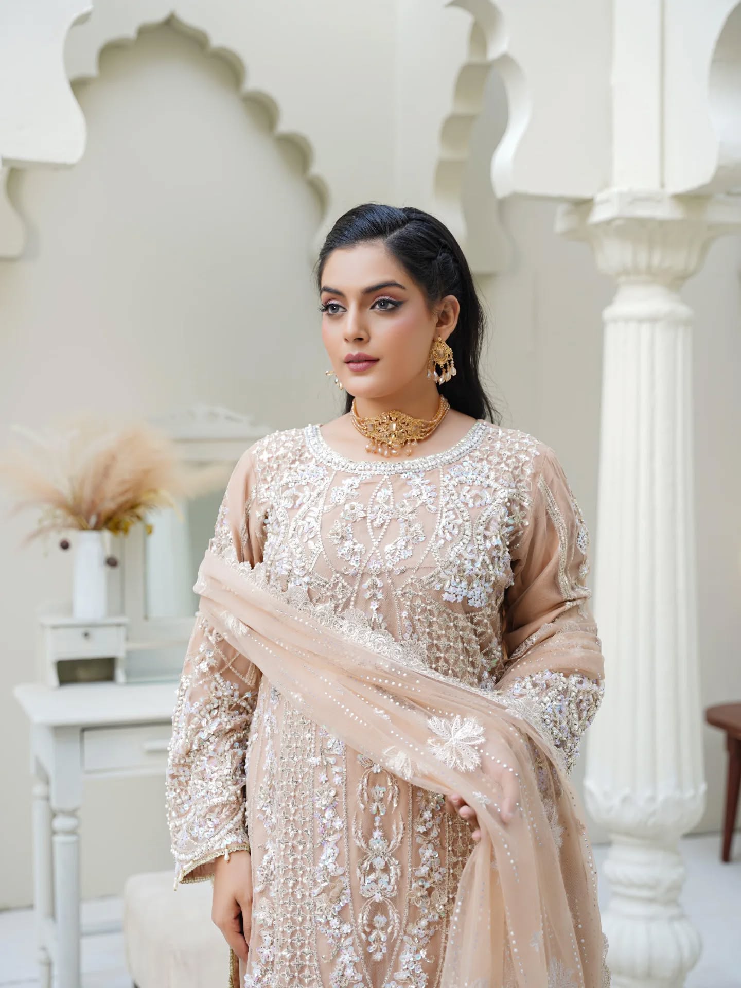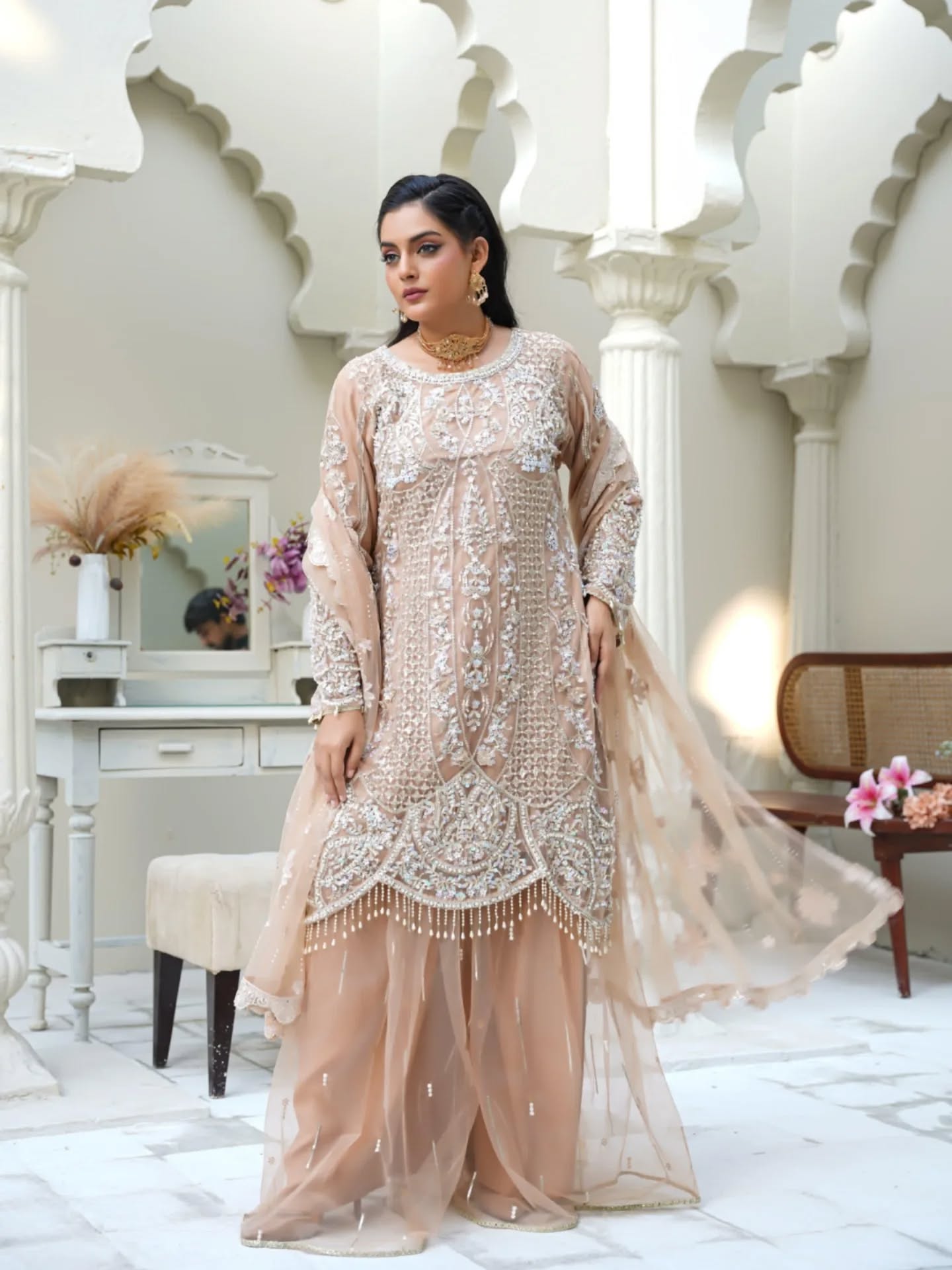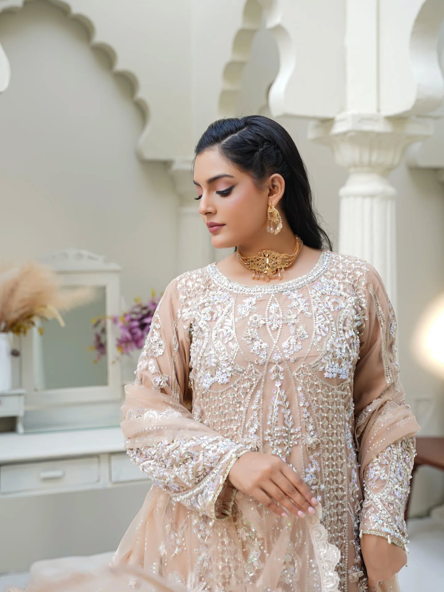 Step into ethereal elegance with this exquisitely embellished ensemble. Delicate net layers and intricate handwork come together to create a look that feels regal, graceful, and beautifully refined. Designed to captivate at every special occasion.