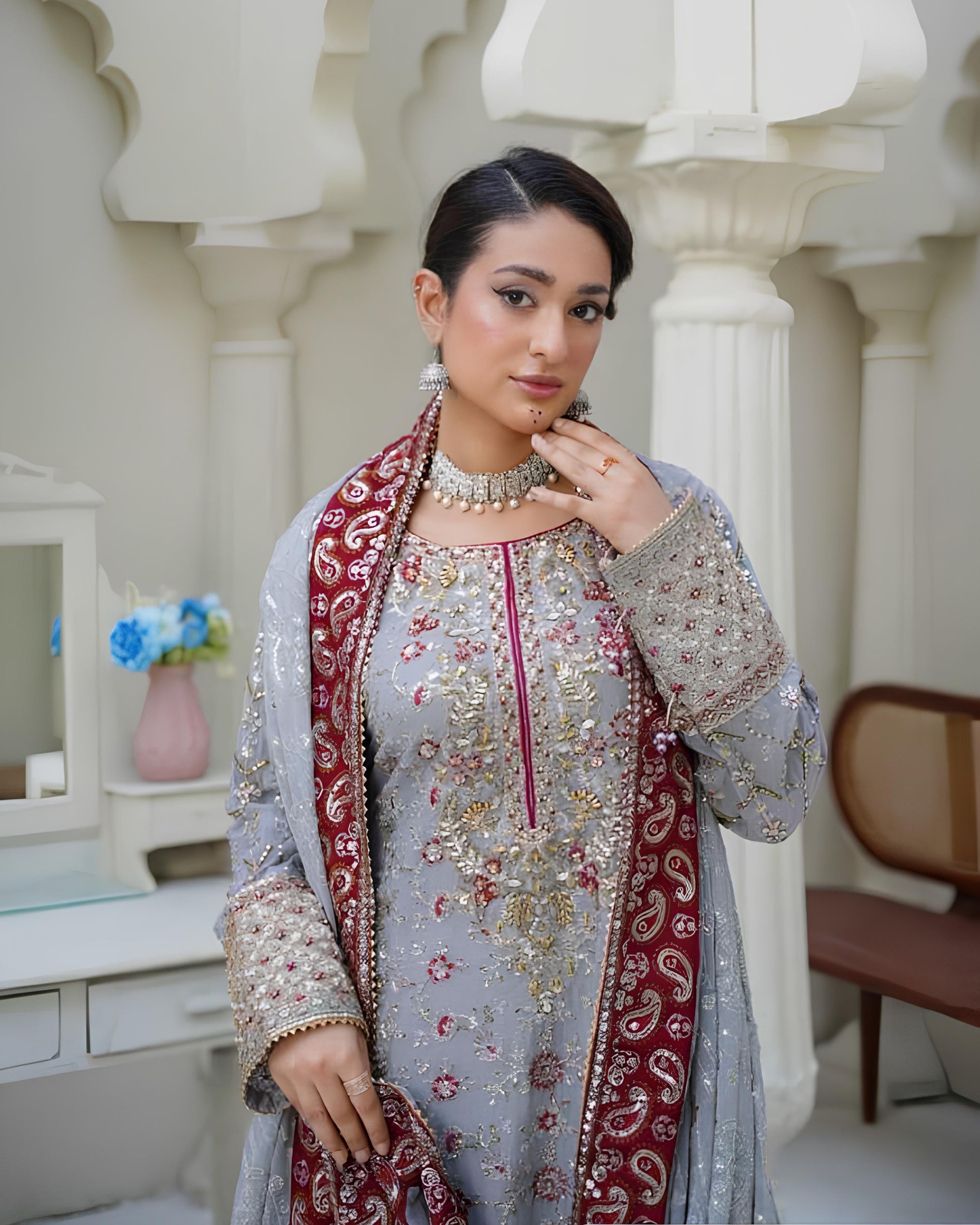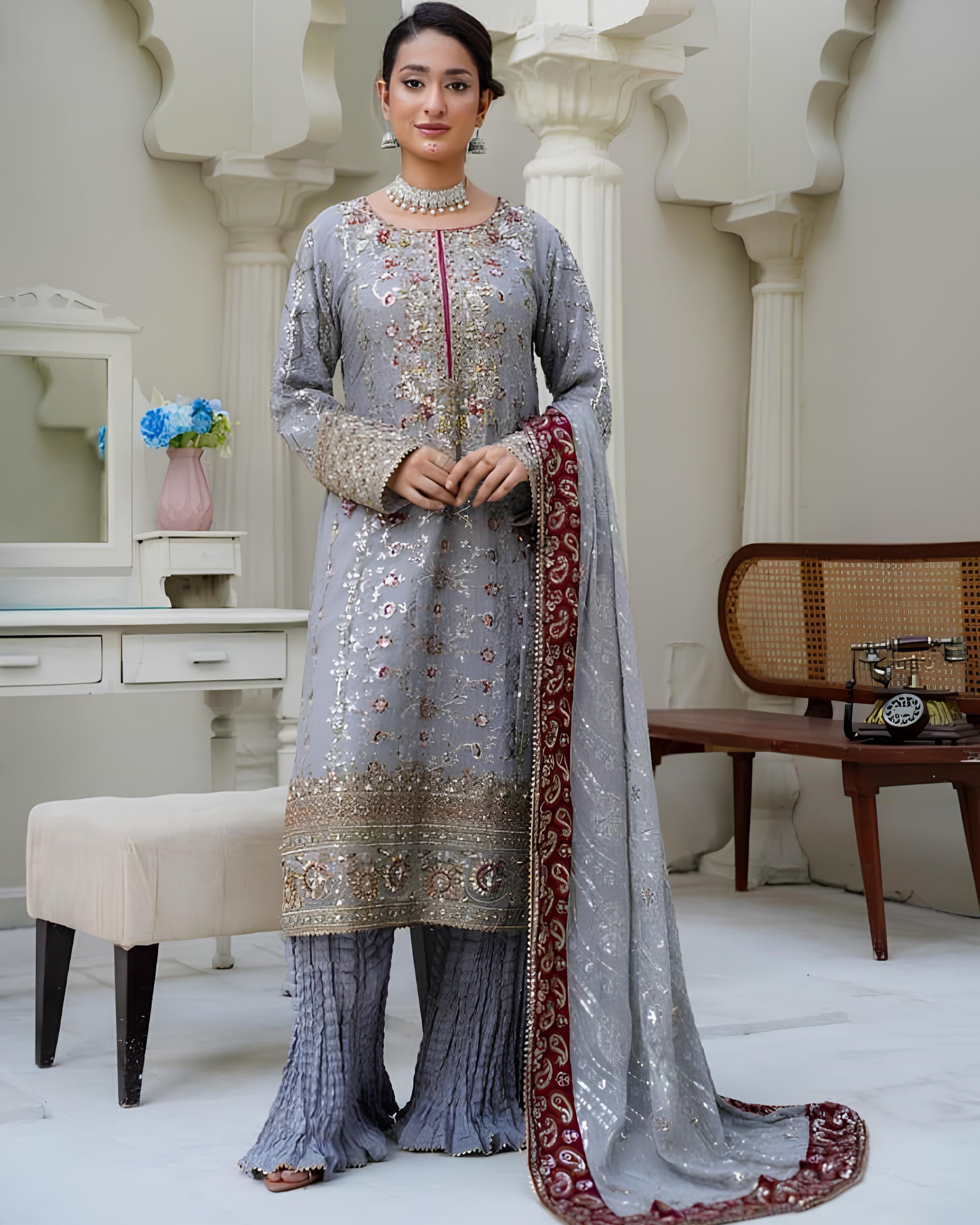 A graceful chiffon straight shirt designed with a refined finish, paired with a flowy grip sharara that adds a modern yet traditional charm. The matching chiffon dupatta completes the look with soft sophistication—perfect for festive evenings and formal gatherings.