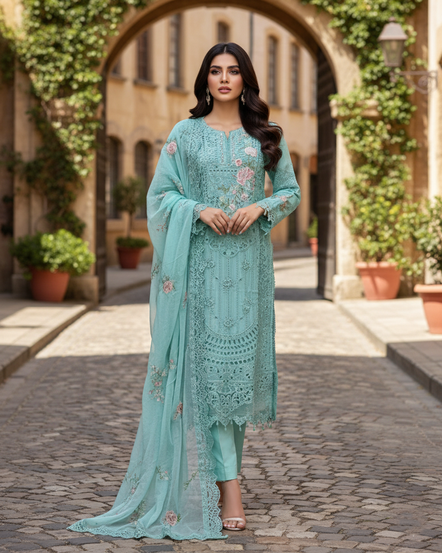 A refined chiffon straight shirt paired with soft viscose trousers for a sleek yet comfortable look. The matching chiffon dupatta completes the outfit with a graceful flow, making it an ideal choice for both festive and semi-formal occasions.