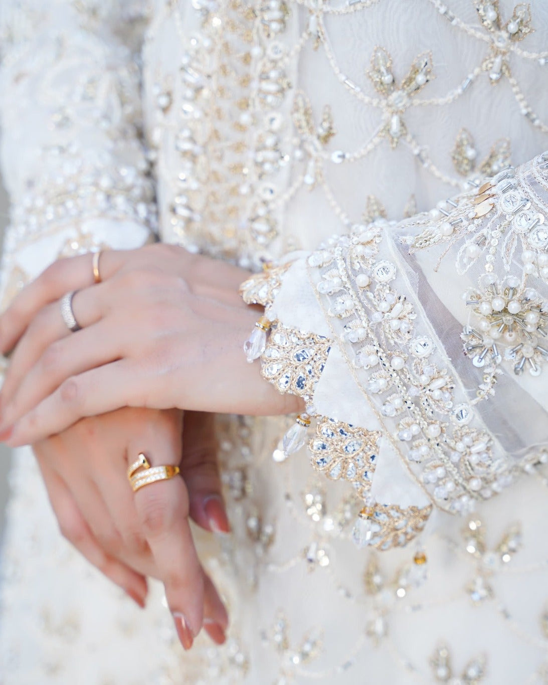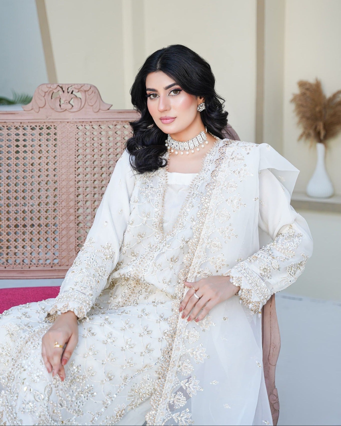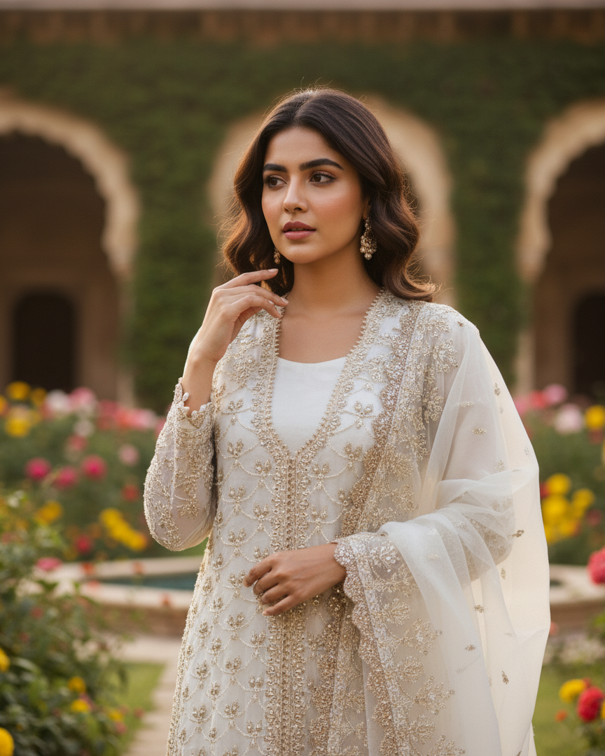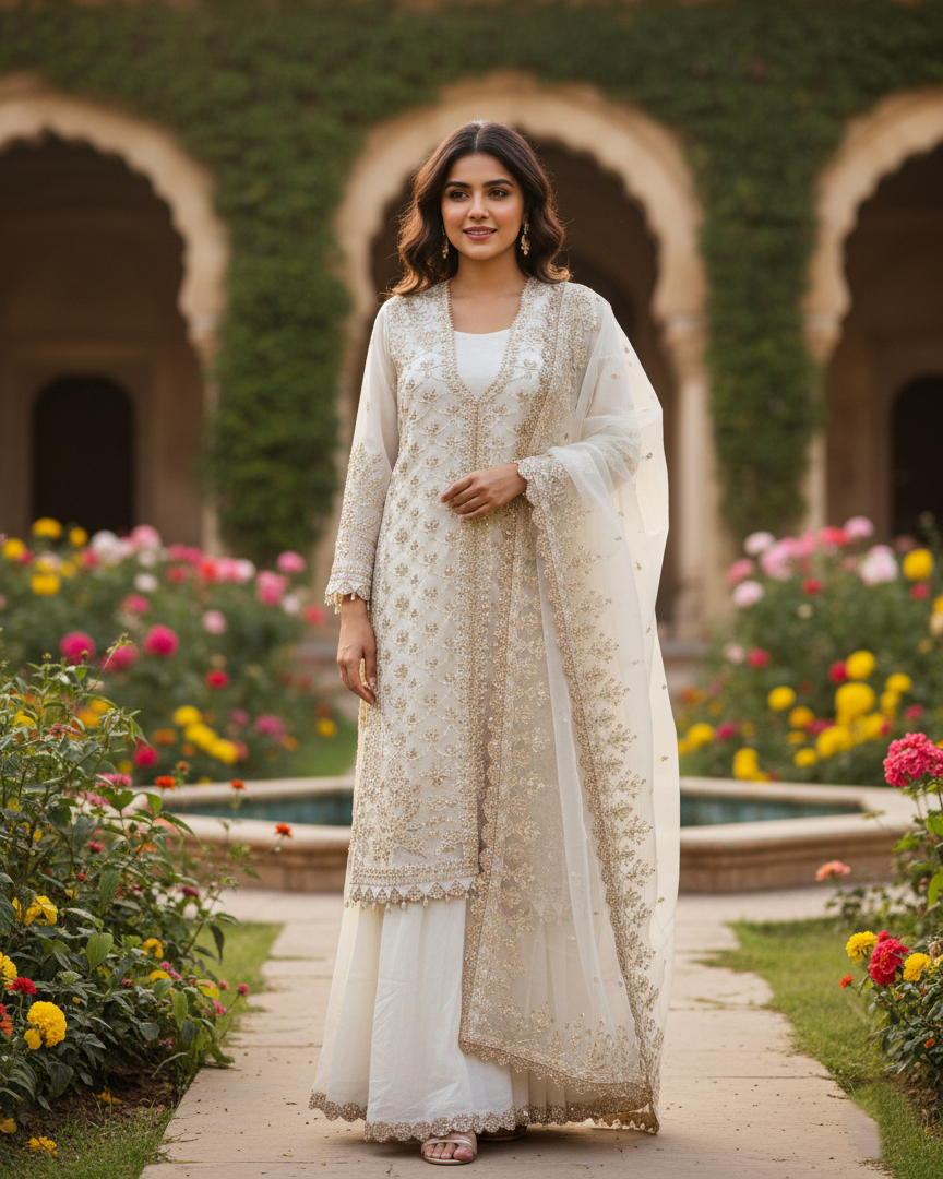 An organza shirt designed in an open gown style, adorned with exquisite cut dana, moti, and handwork on the sleeves. Thread sequin detailing adds a refined shimmer, making it a true festive statement. Paired with grip plazo for modern elegance and an organza dupatta that completes the graceful look.