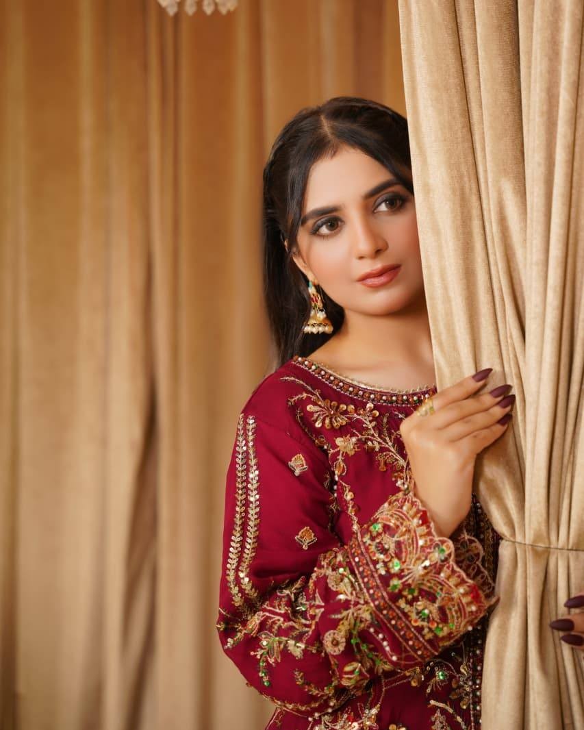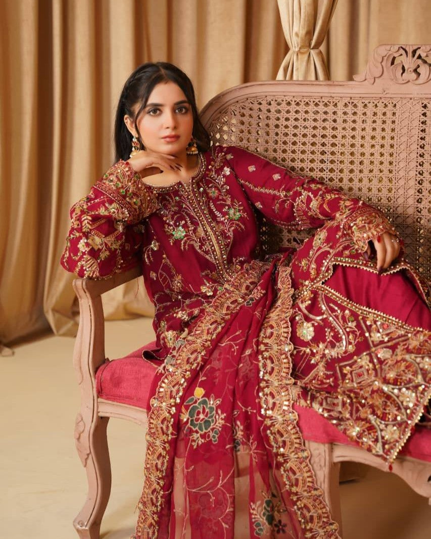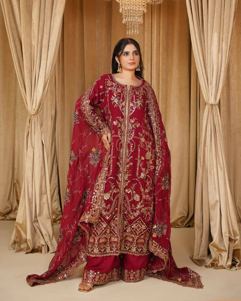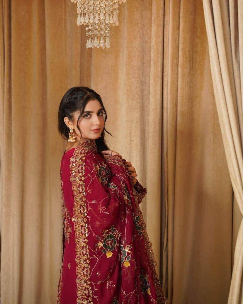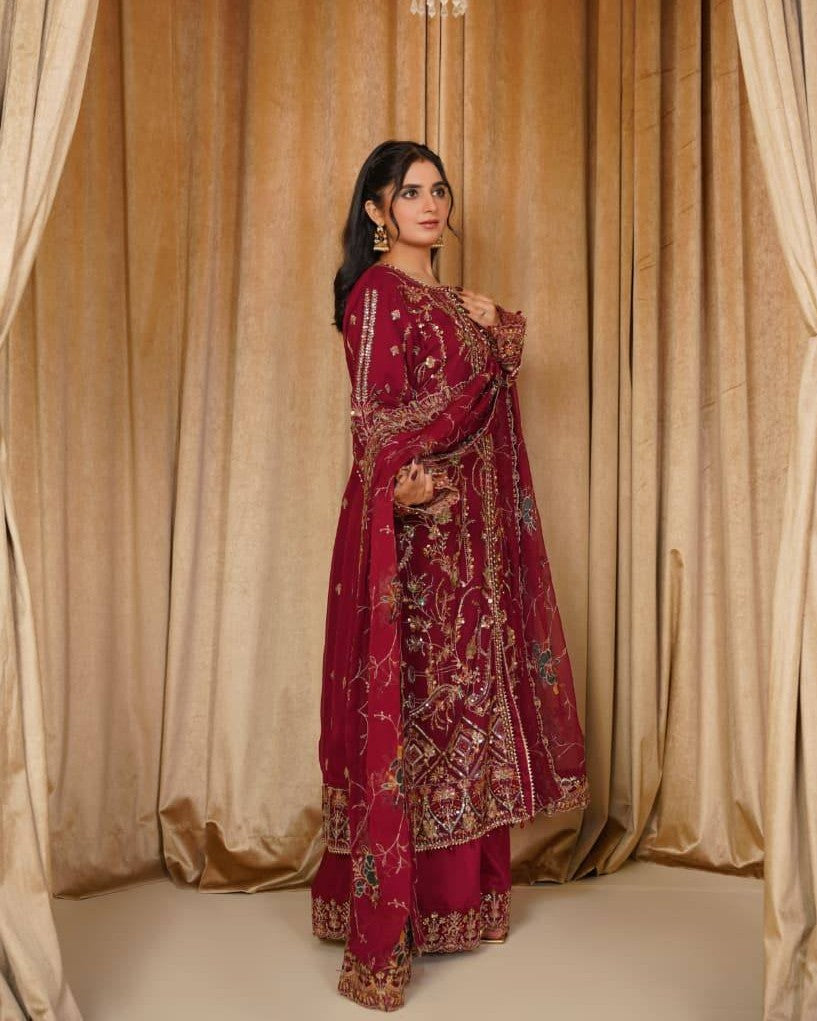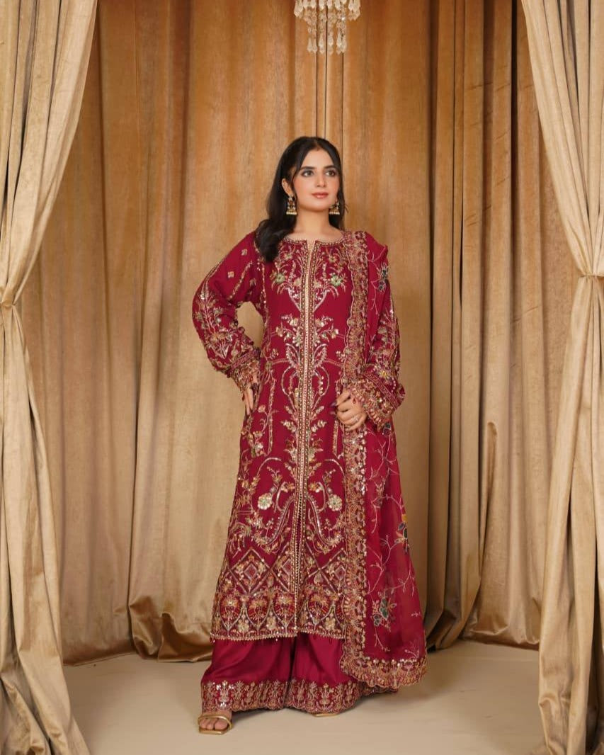 A chiffon shirt delicately detailed with pearls, sequins, and tilla work, creating a soft yet elegant festive look. Paired with a smooth grip trouser for a refined silhouette, and a matching chiffon dupatta that adds graceful charm to the ensemble.