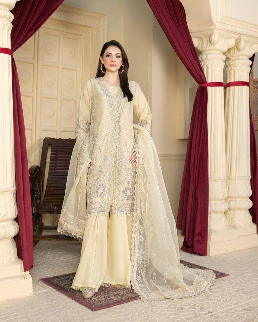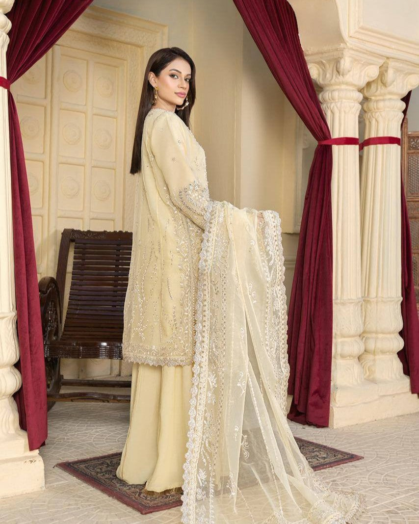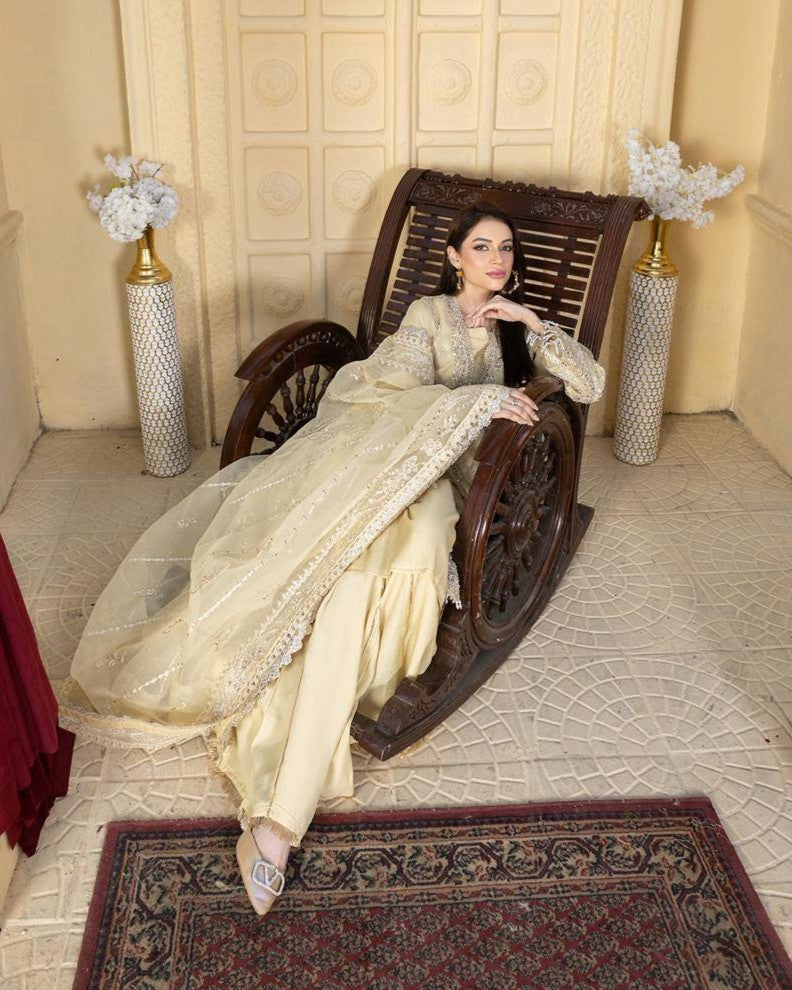 A graceful organza shirt beautifully adorned with tilla, sequin, and pearl work, giving it an elegant festive charm. Paired with a chic grip sharara for a flattering silhouette and an organza dupatta that adds a soft, refined finish to the look.
