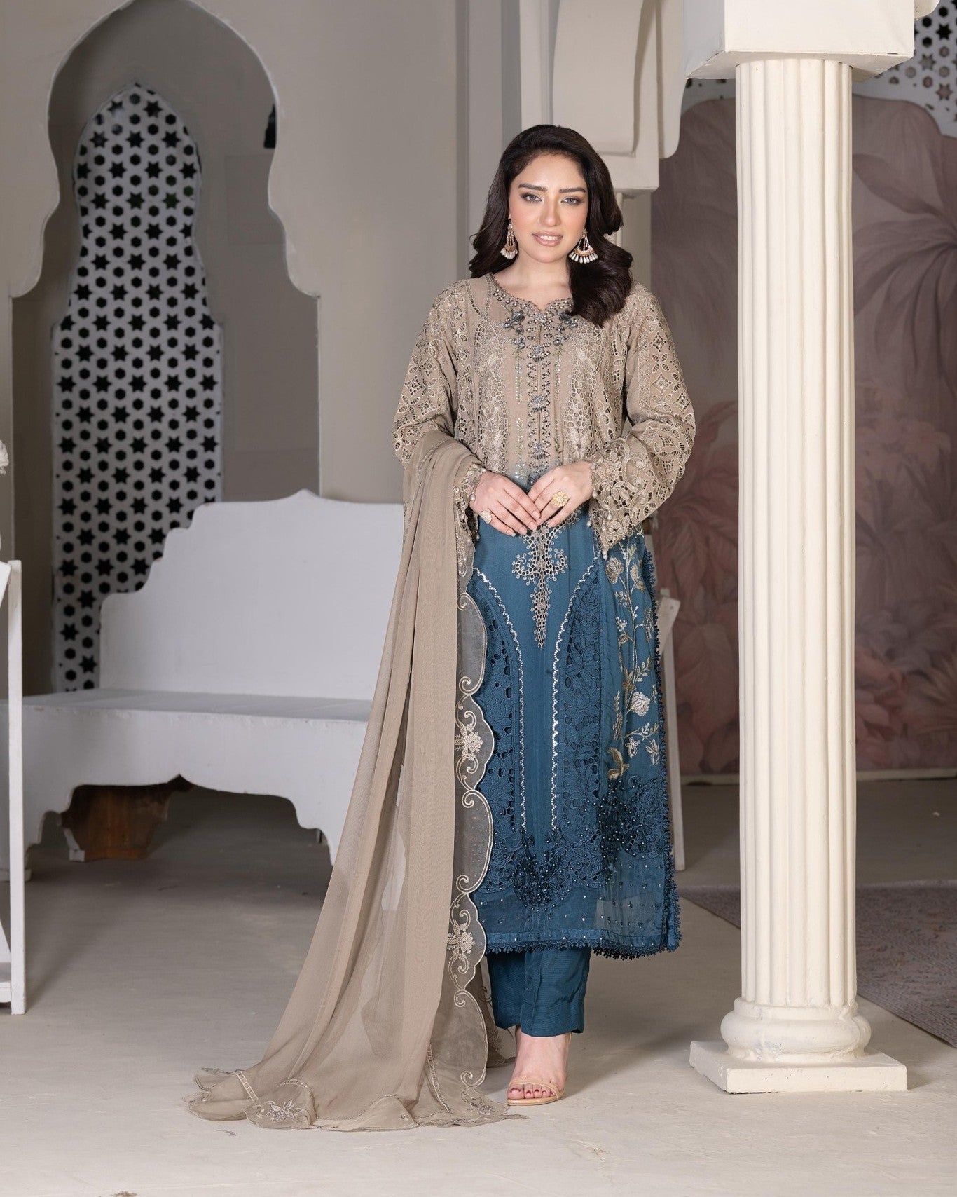 An elegant chiffon shirt paired with a smooth grip trouser for a sleek and refined look. The chiffon dupatta, finished with organza patch detailing, adds a graceful touch—perfect for festive and semi-formal occasions.