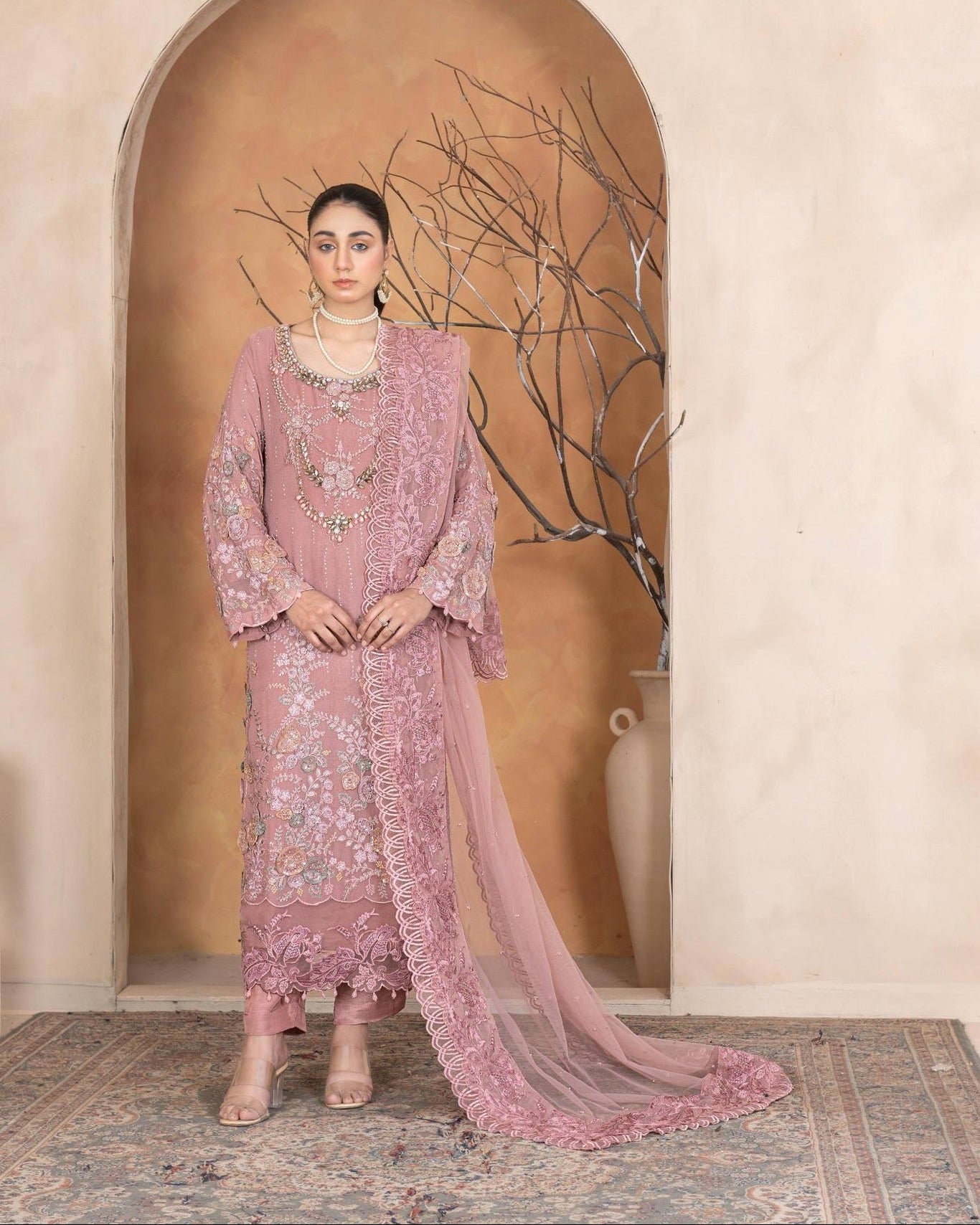 An organza shirt beautifully adorned with stone work and delicate pearl settings, giving it a soft and luxurious appeal. Paired with a smooth grip trouser for a refined fit and a net dupatta that adds a graceful, airy finish — perfect for formal occasions.