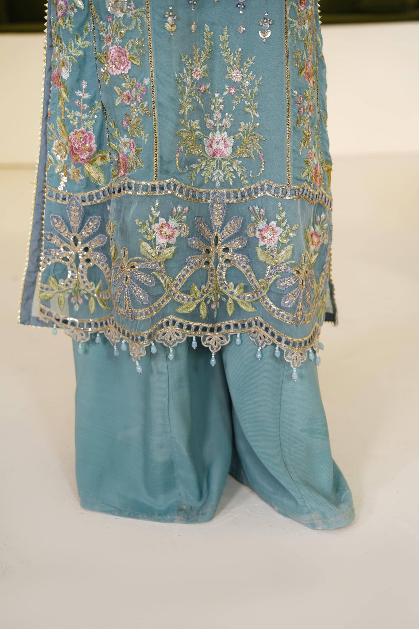 Shirt: Chiffon shirt with a 48-inch length, exquisitely designed with tilla, sequence, and fine hand embroidery.