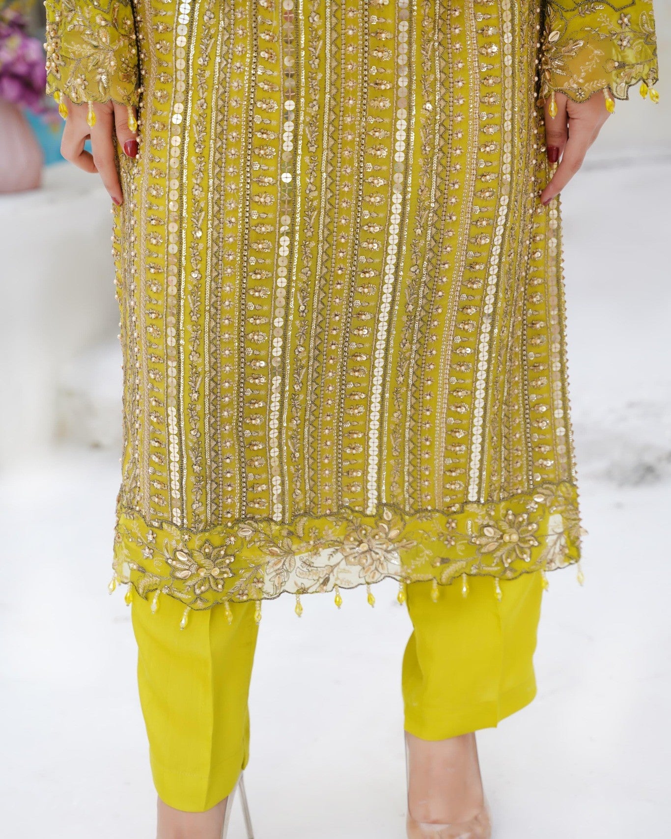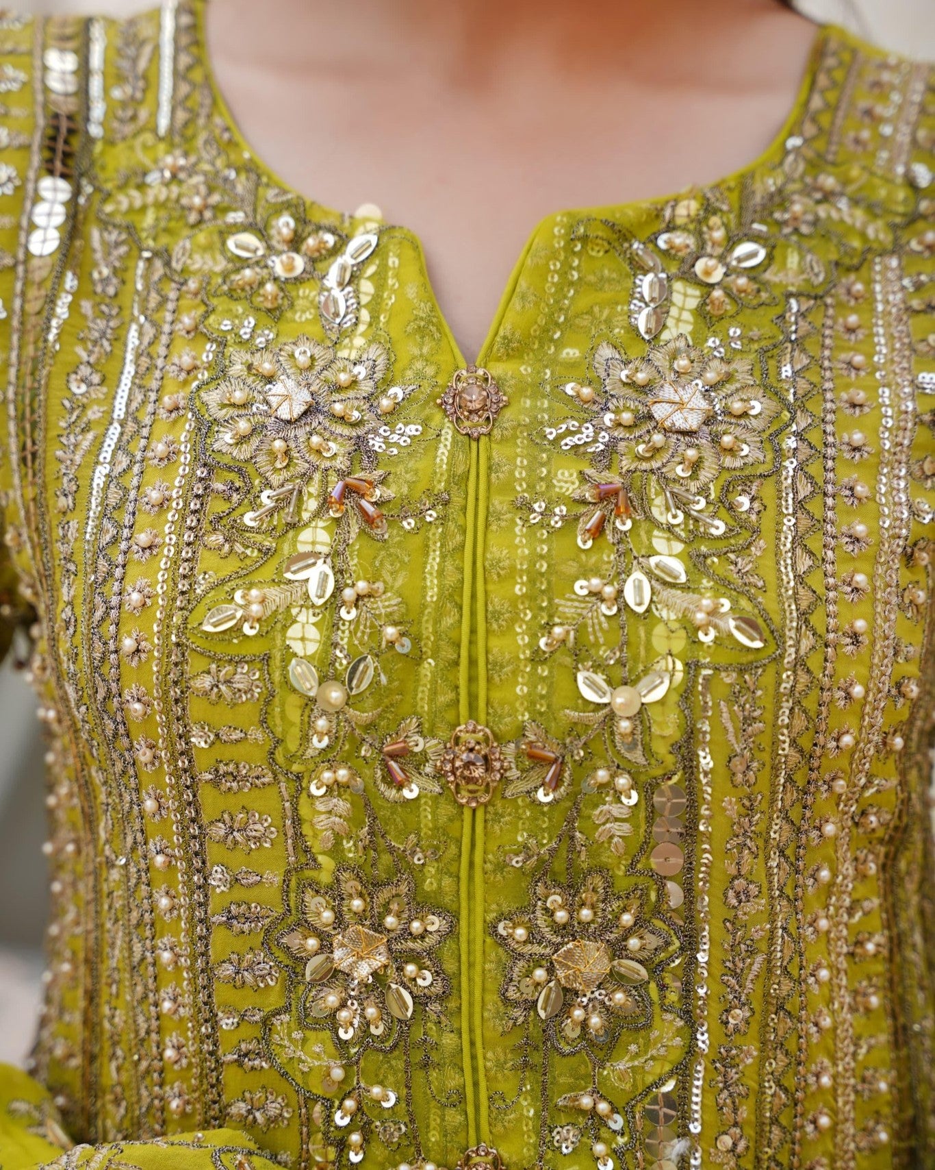 A beautifully refined outfit with elegant detailing. The organza fabric paired with handmade thread, tilla, sequins, and pearl work delivers a graceful sparkle — perfect for festive gatherings or dawat wear.