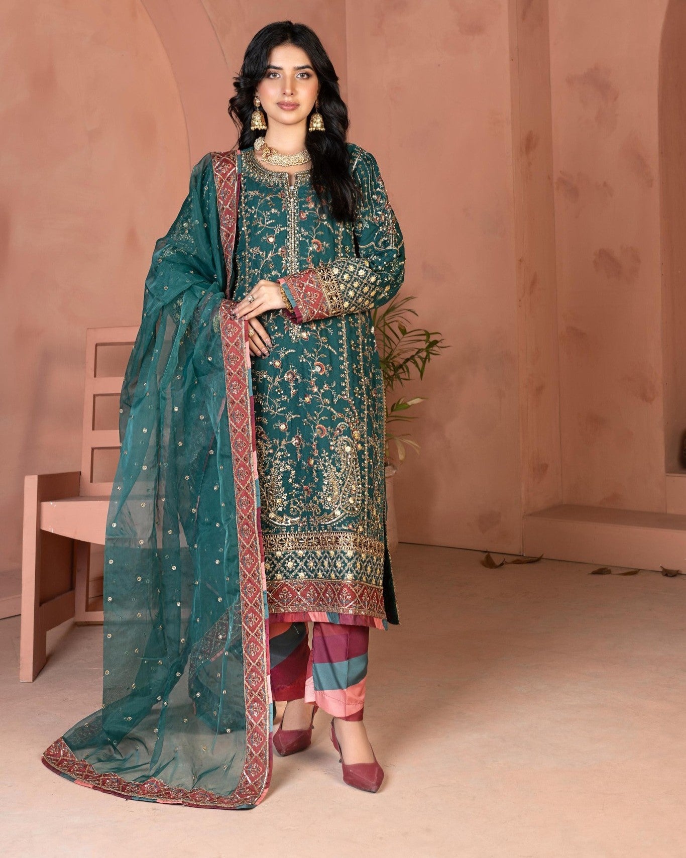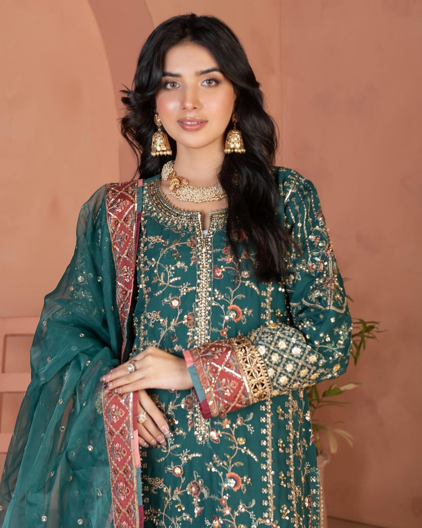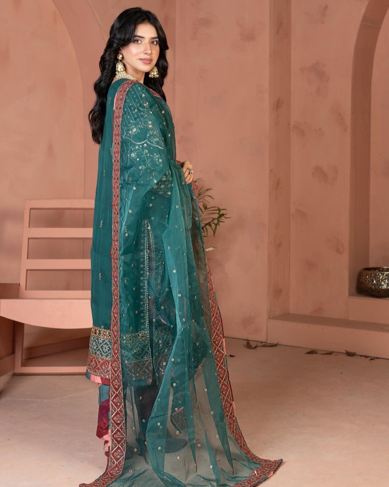 Dupatta: Organza embroidered dupatta, adding a light yet luxurious layer to complete the ensemble beautifully.