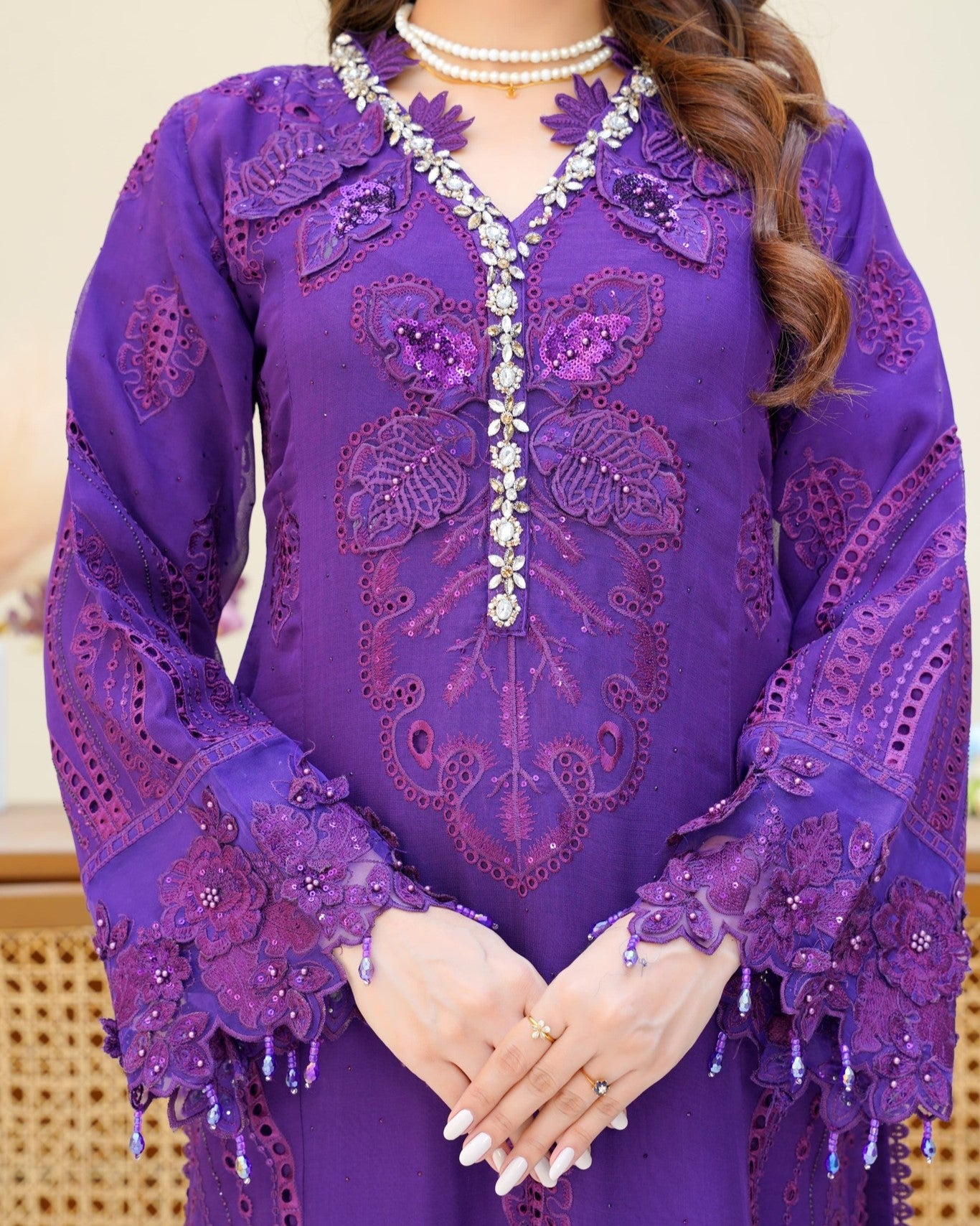 A timeless and dreamy look crafted with soft chiffon and delicate embellishments. The artistry of handwork and the flow of fabric give this outfit an elegant aura — perfect for festive gatherings and graceful appearances.