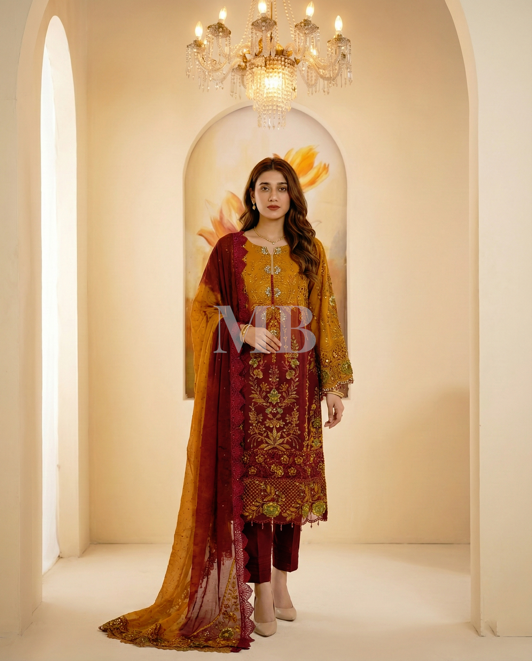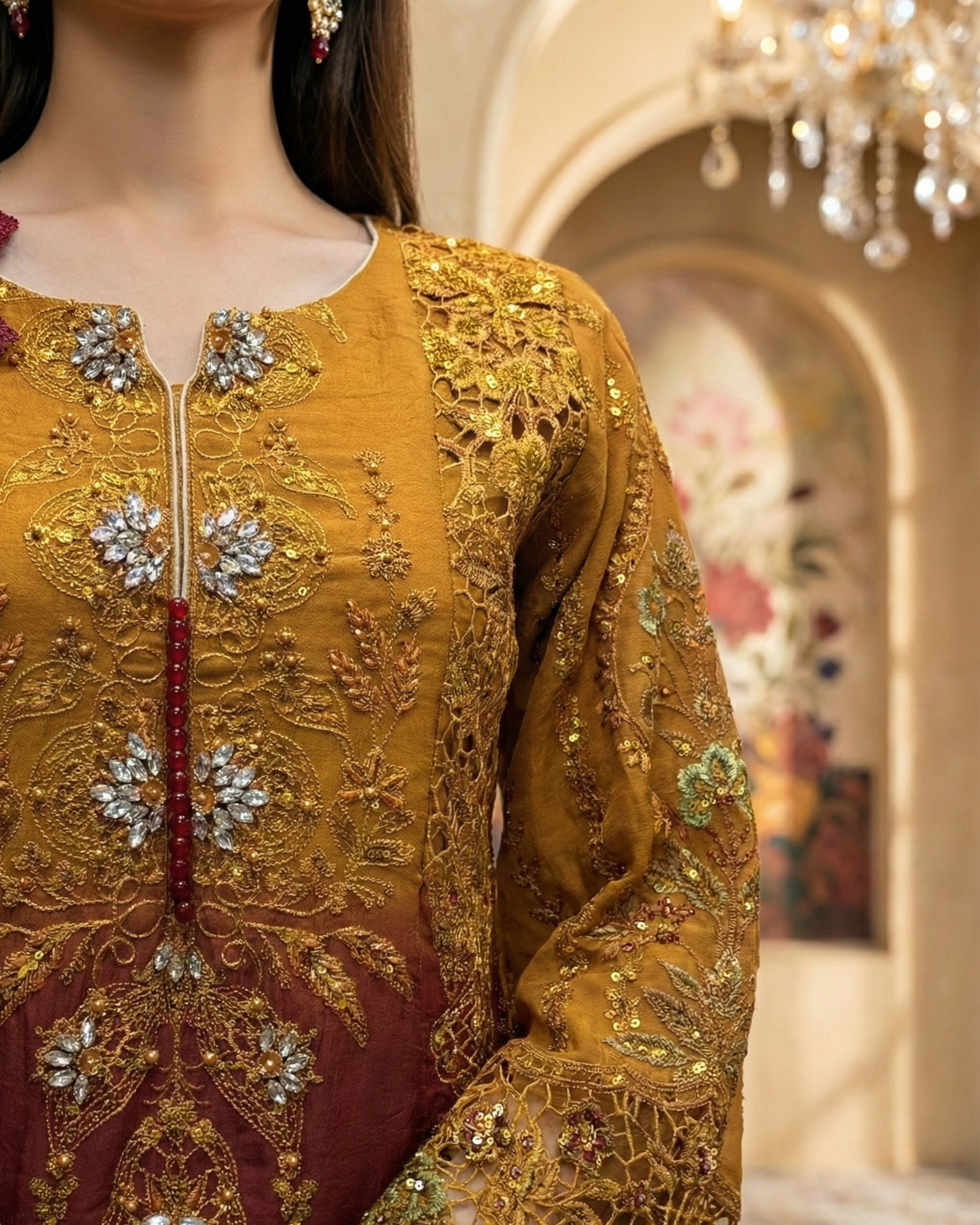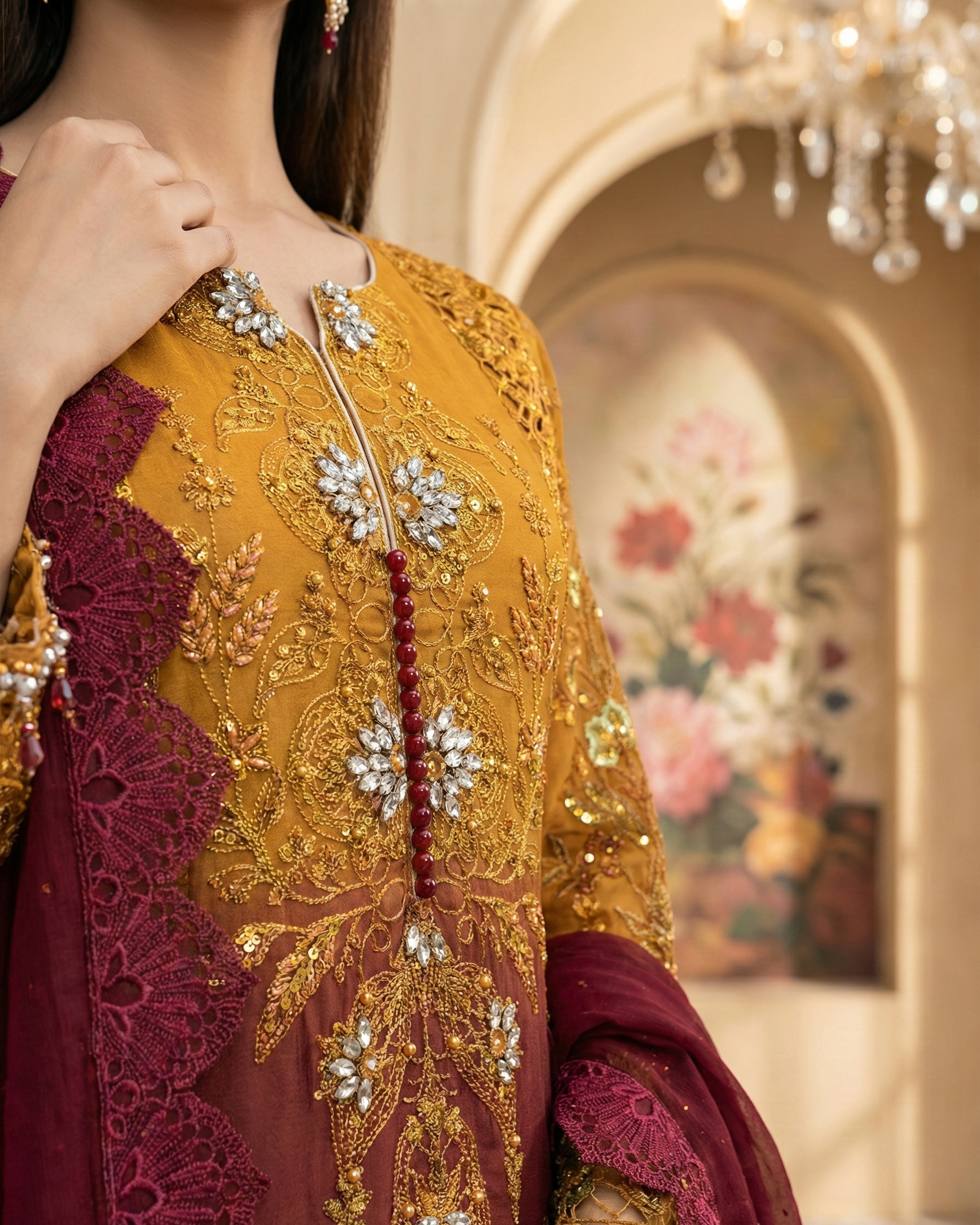 Dupatta: Chiffon embroidered dupatta, adding movement and sophistication to complete the outfit.
