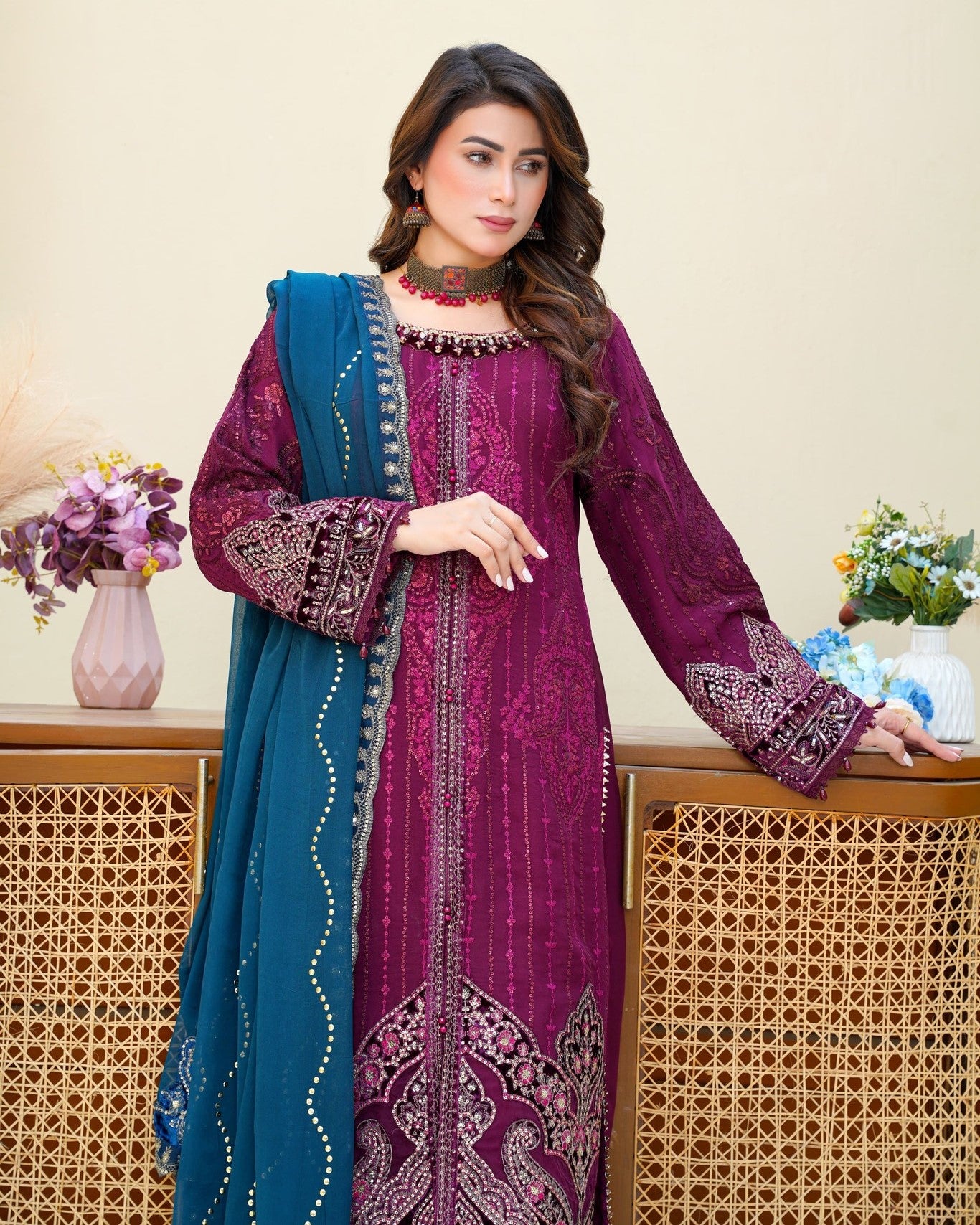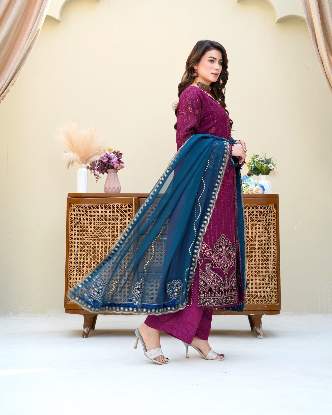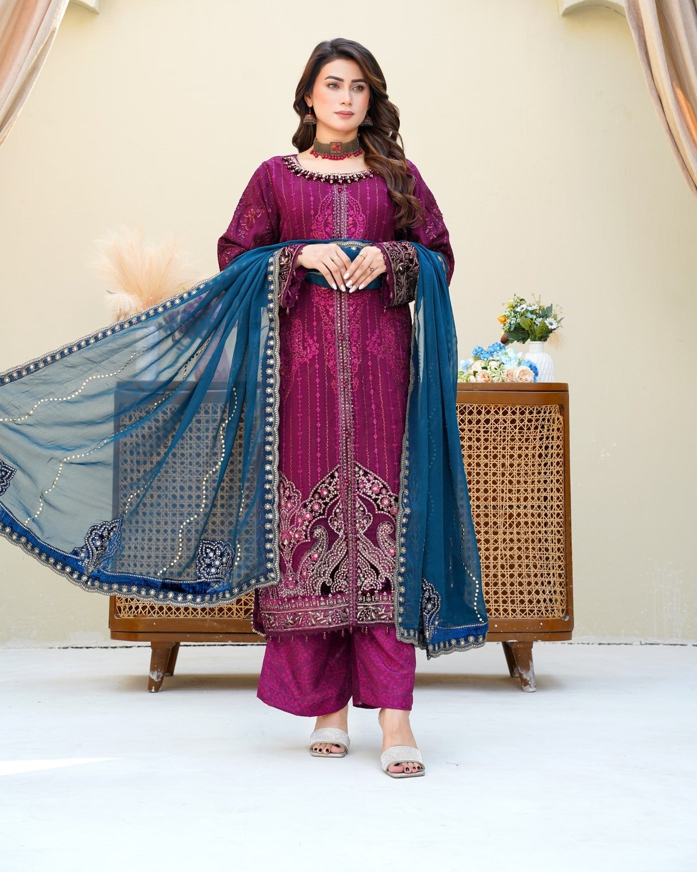 Dupatta: Embroidered chiffon dupatta, adding a refined touch and graceful movement to complete the look.