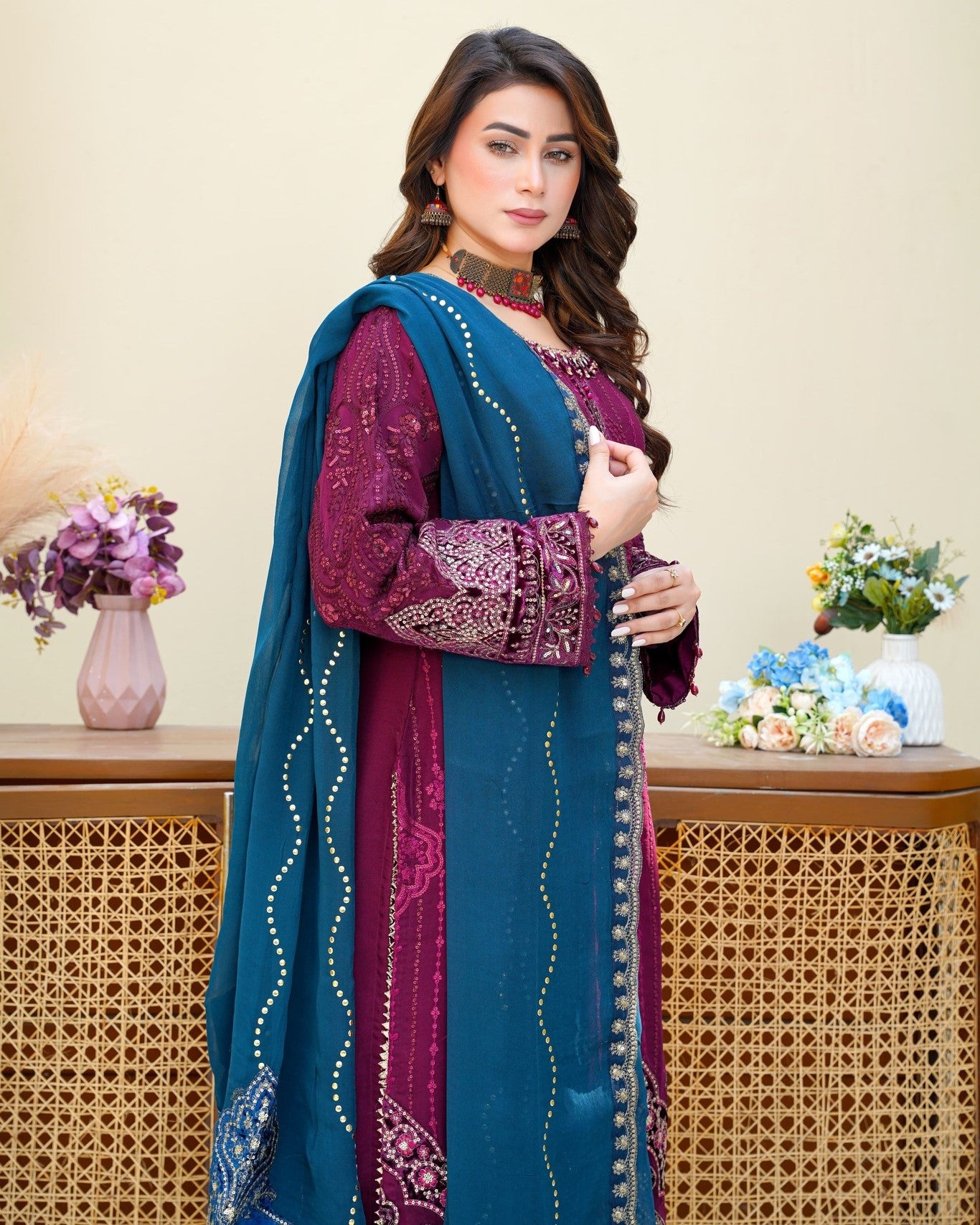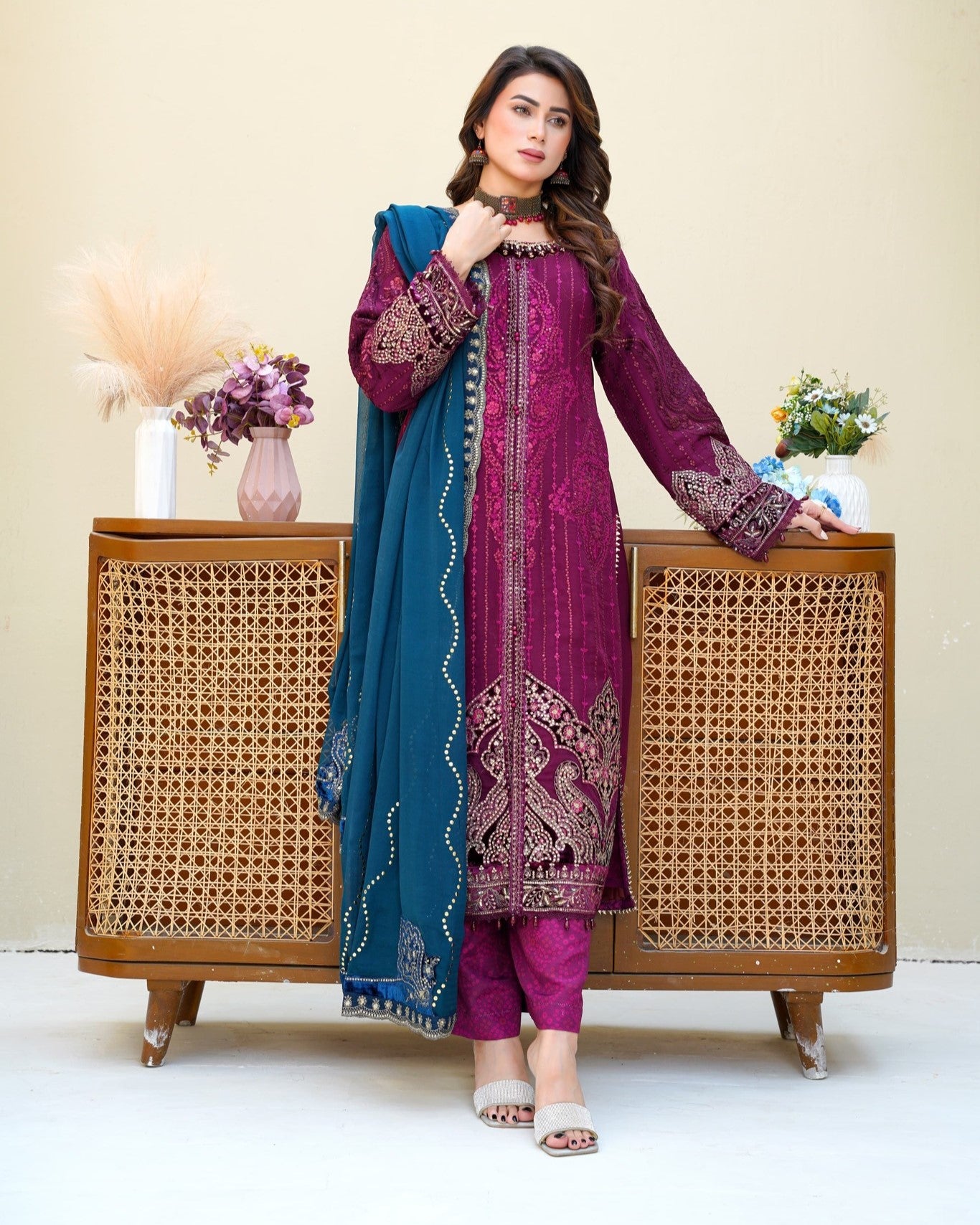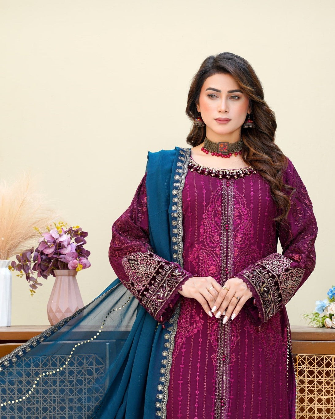 Dupatta: Embroidered chiffon dupatta, adding a refined touch and graceful movement to complete the look.