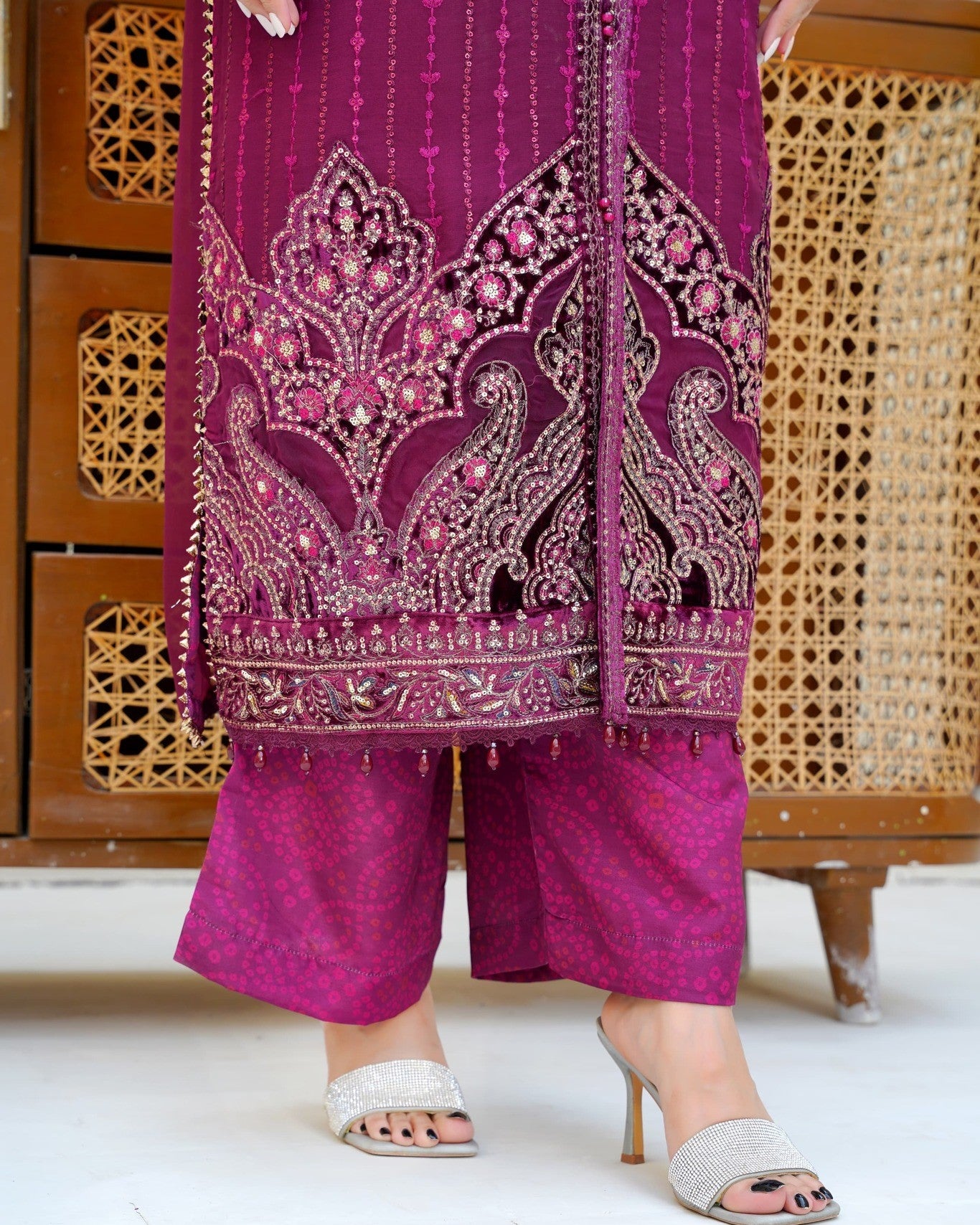 Shirt: Chiffon shirt with a full 48-inch length, beautifully enhanced with tilla, sequence, and delicate hand embroidery.