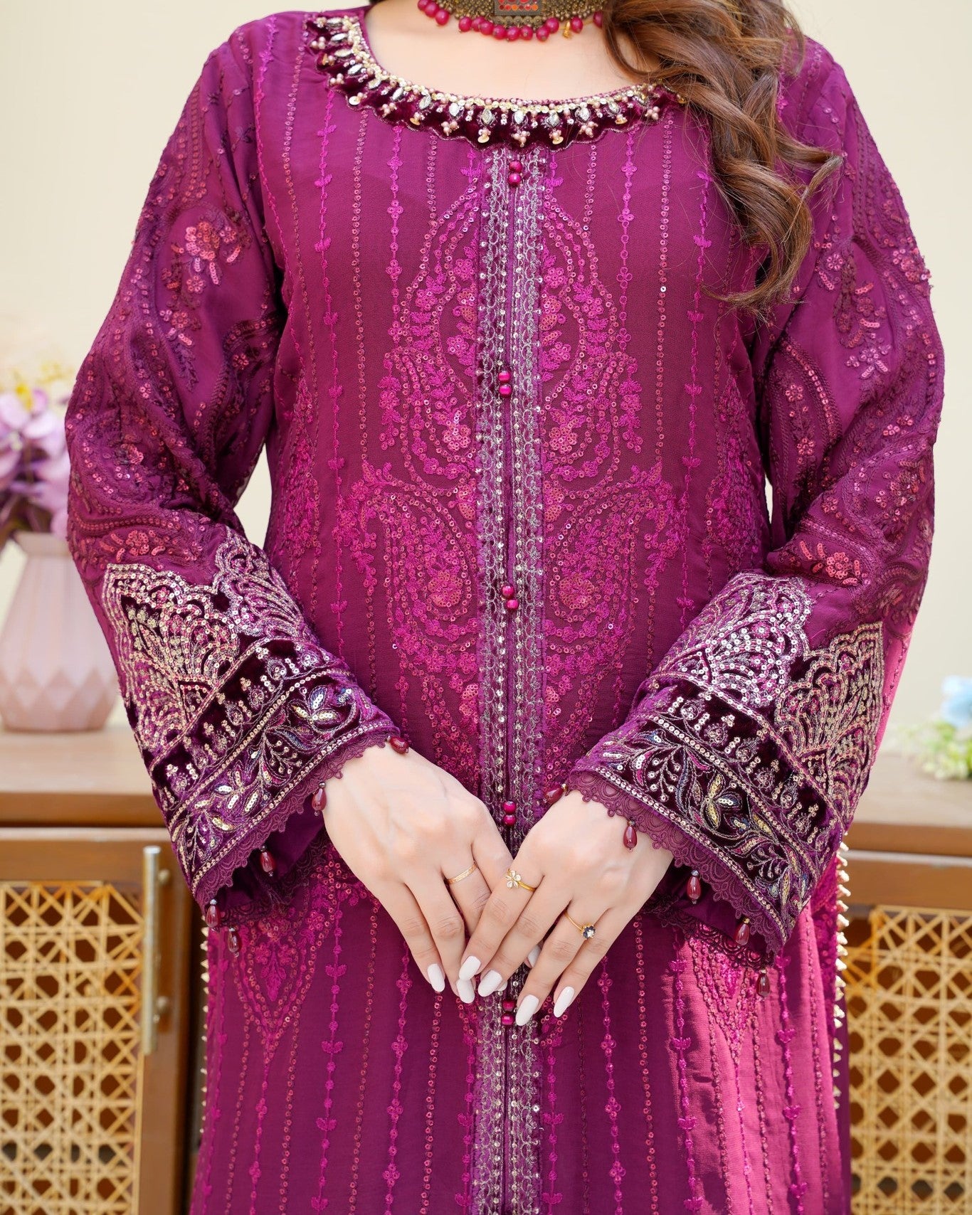 Experience a soft and refined charm with this elegant ensemble. The flow of chiffon and the touch of intricate handwork create a look that feels graceful, luxurious, and perfect for every special moment.