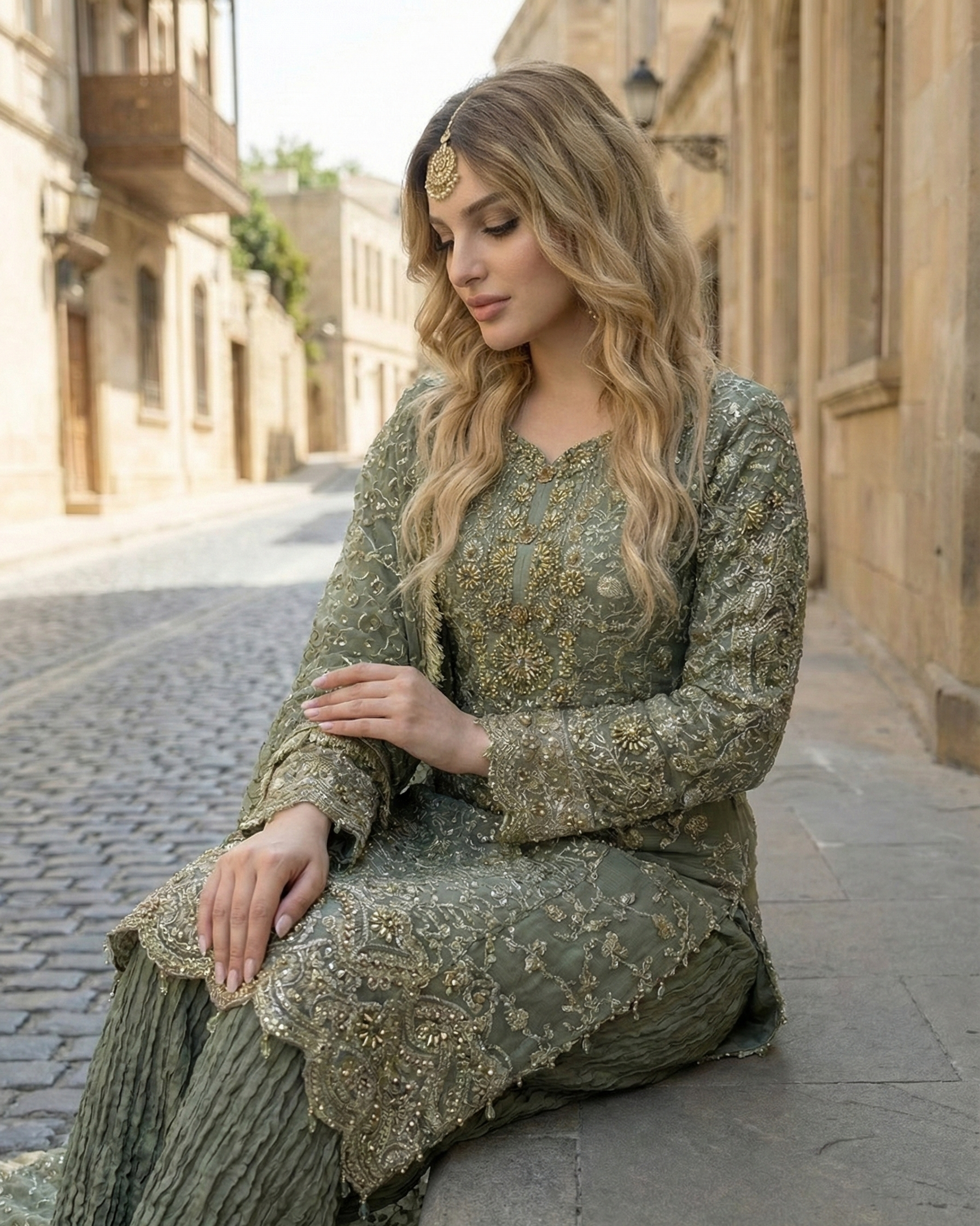 Sharara: Grip sharara designed with a graceful flare, providing comfort and an elegant silhouette.
