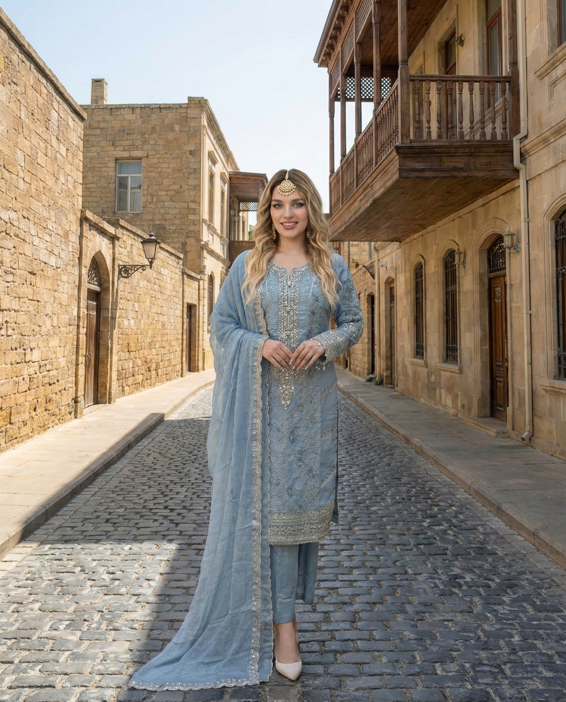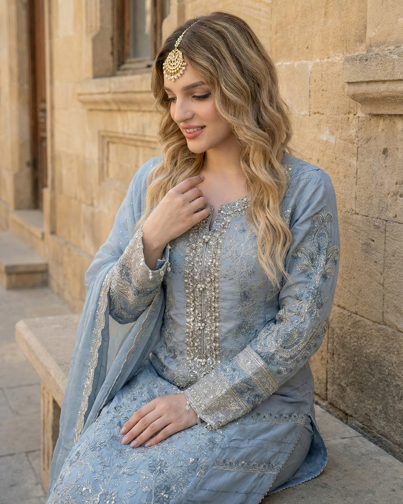 Dupatta: Chiffon dupatta featuring delicate spray work, completing the look with a soft and refined touch.
