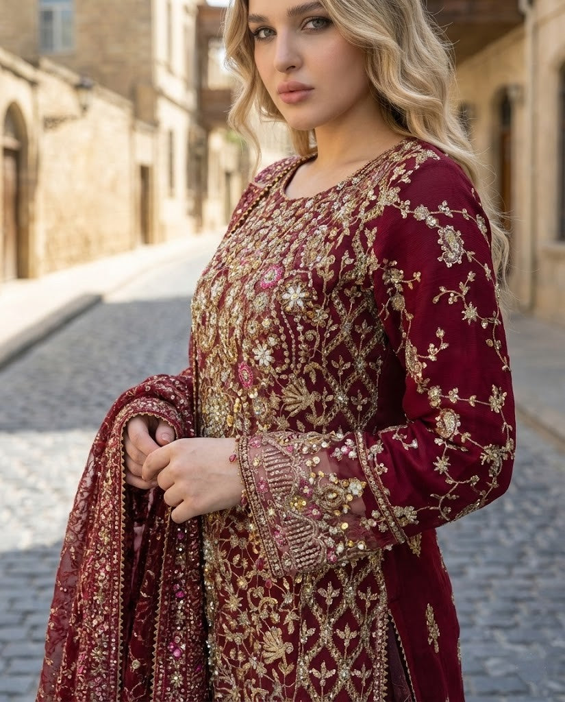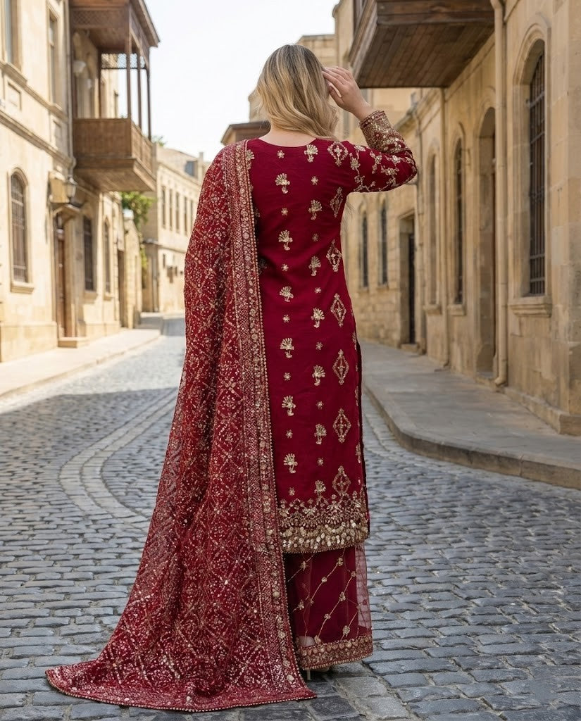 Discover the perfect look. Its flowing chiffon and net fabrics, rich embellishments, and graceful silhouette create a luxurious festive ensemble, ideal for weddings, dawat, and evening occasions. Designed for comfort and elegance, it brings a refined and glamorous charm to your wardrobe.