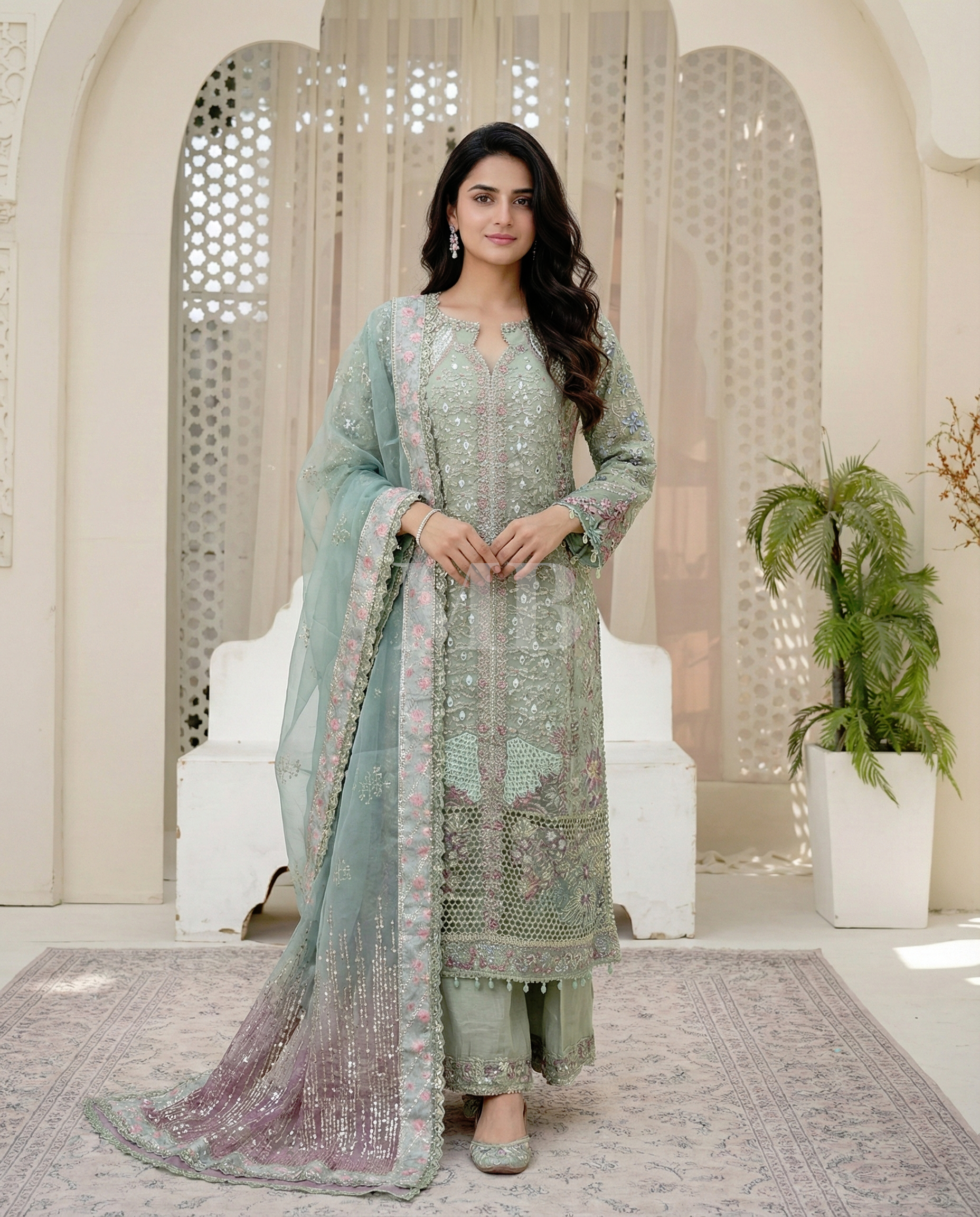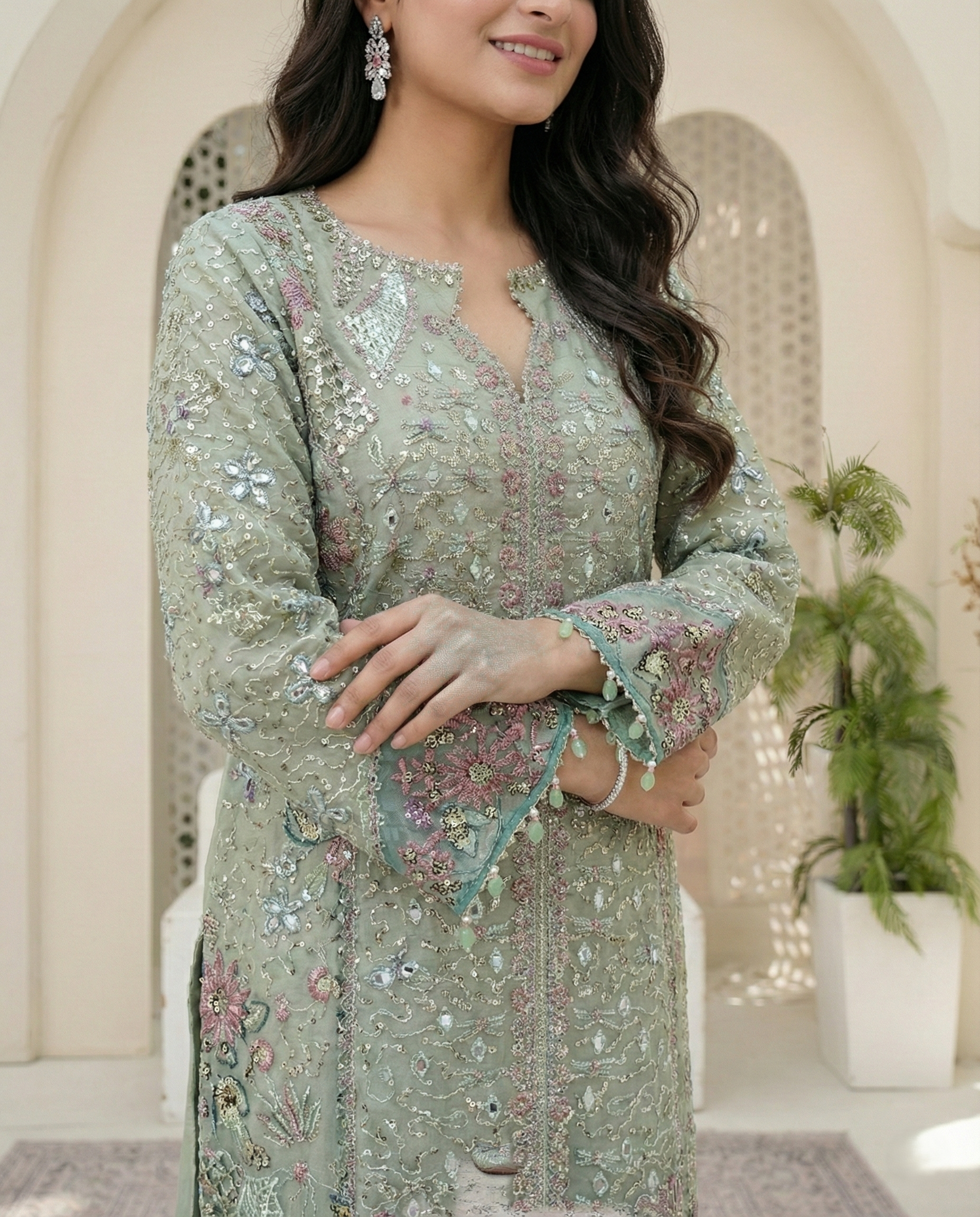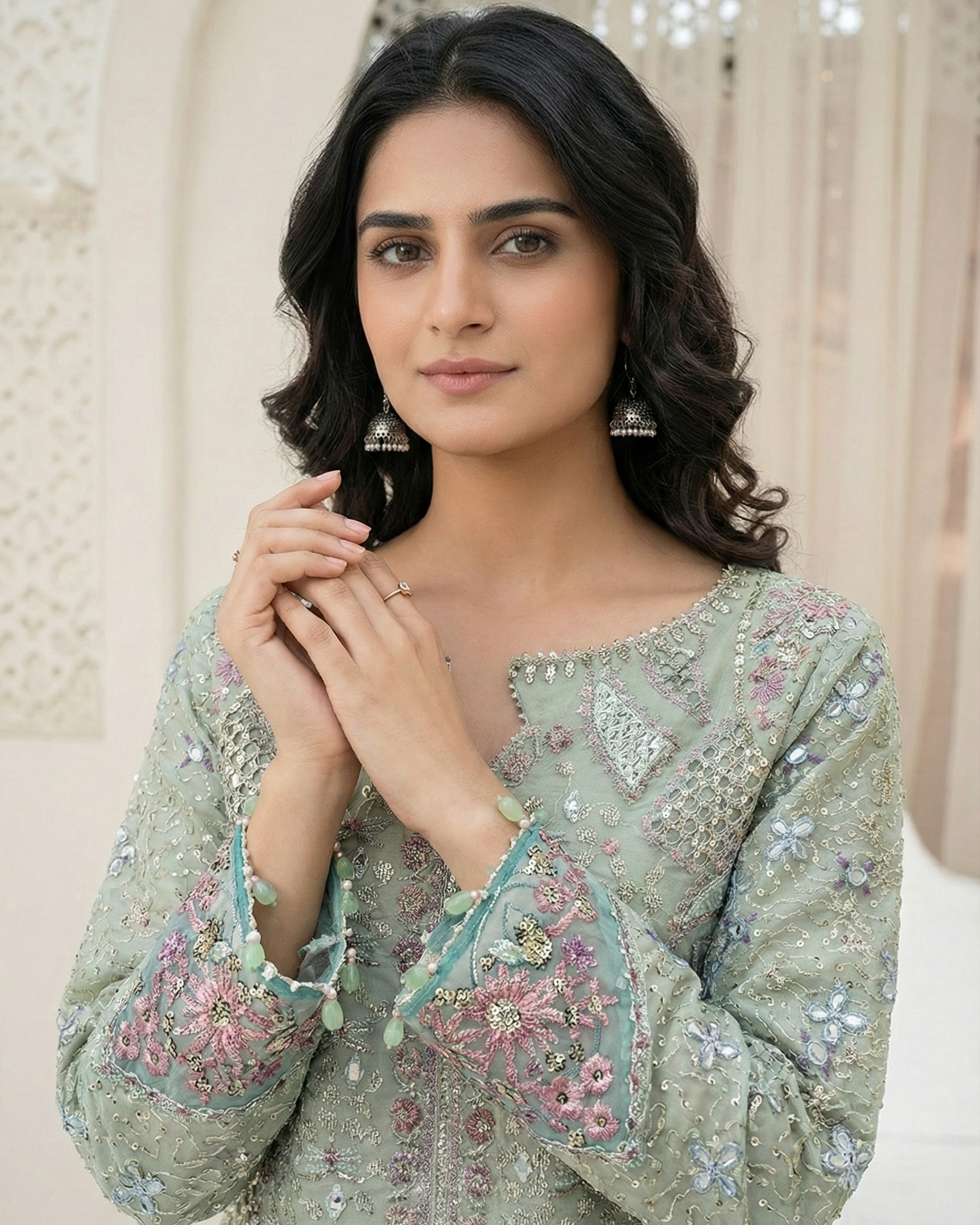 Step into refined glamour with this exquisitely embellished ensemble. Sheer organza paired with intricate handwork creates a look that feels festive, graceful, and undeniably luxurious. Designed to stand out with elegance and charm.