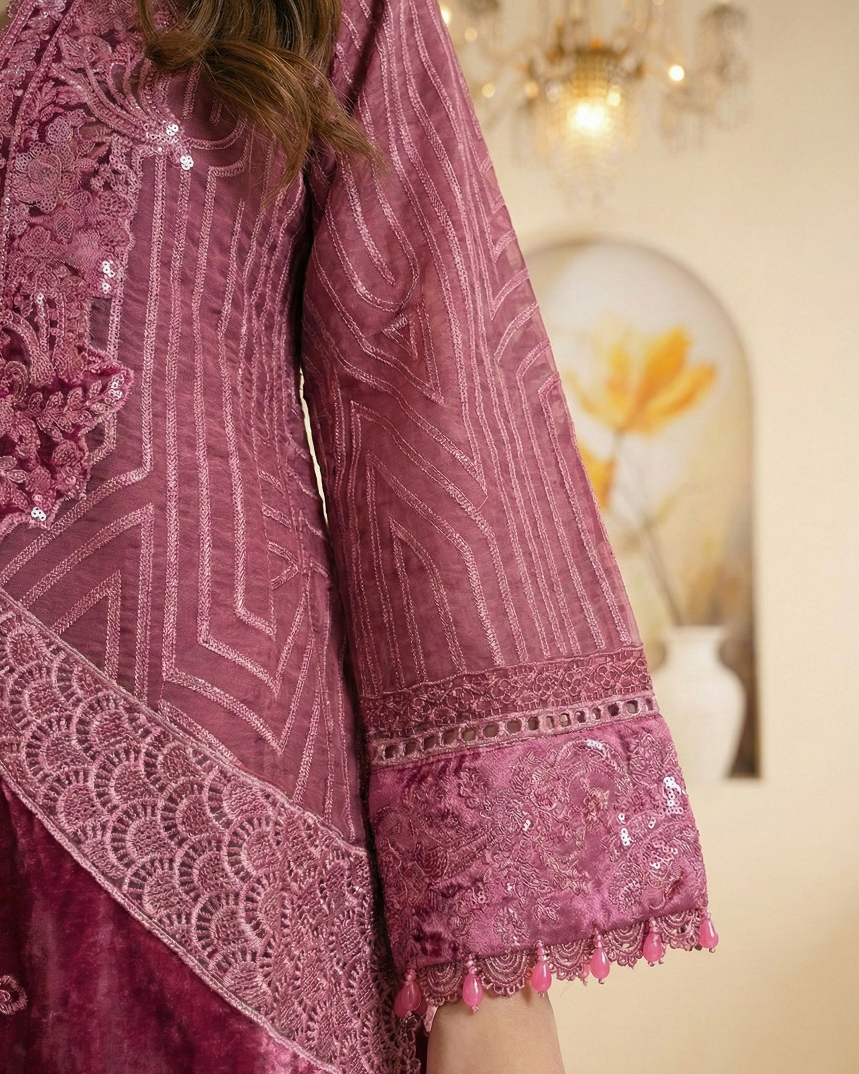 A vision of modern elegance infused with rich textures and graceful detailing. This ensemble blends airy organza with plush velvet accents, creating a refined silhouette that feels both luxurious and effortlessly wearable.