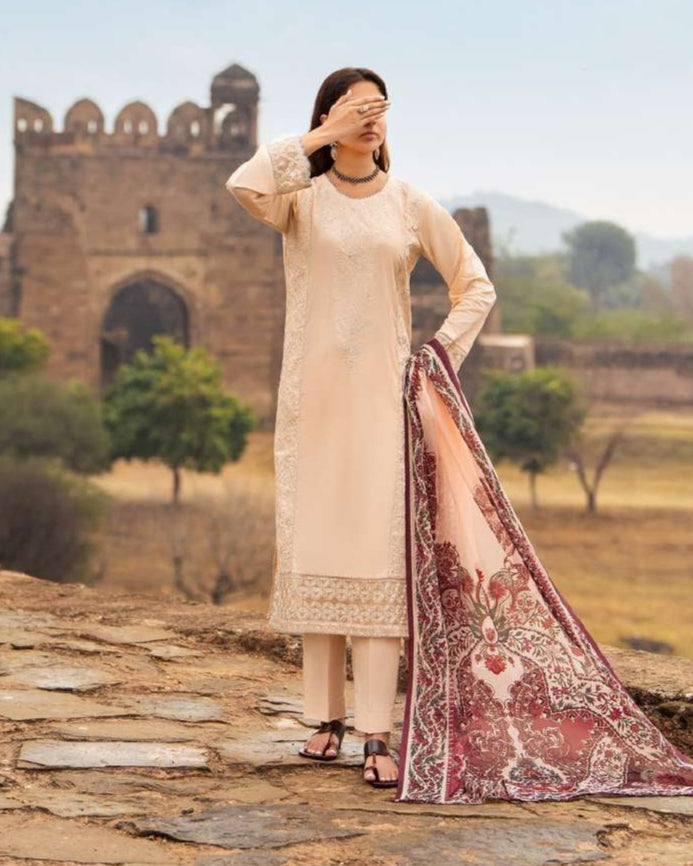 Step into timeless elegance with this stunning long, straight-cut kurta adorned with delicate embroidery along the neckline, sleeves, and hem. The intricate detailing exudes grace, making it a perfect choice for any occasion. Paired with matching straight trousers, this ensemble offers a refined, sophisticated look. The highlight of the outfit is the beautifully printed dupatta, featuring intricate floral and paisley patterns in rich maroon and green hues, which adds a bold contrast and a touch of sophistication to the overall design.