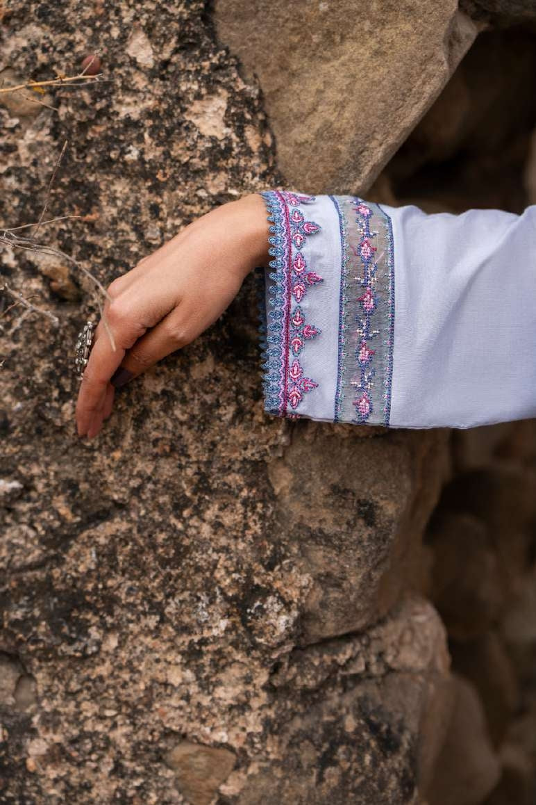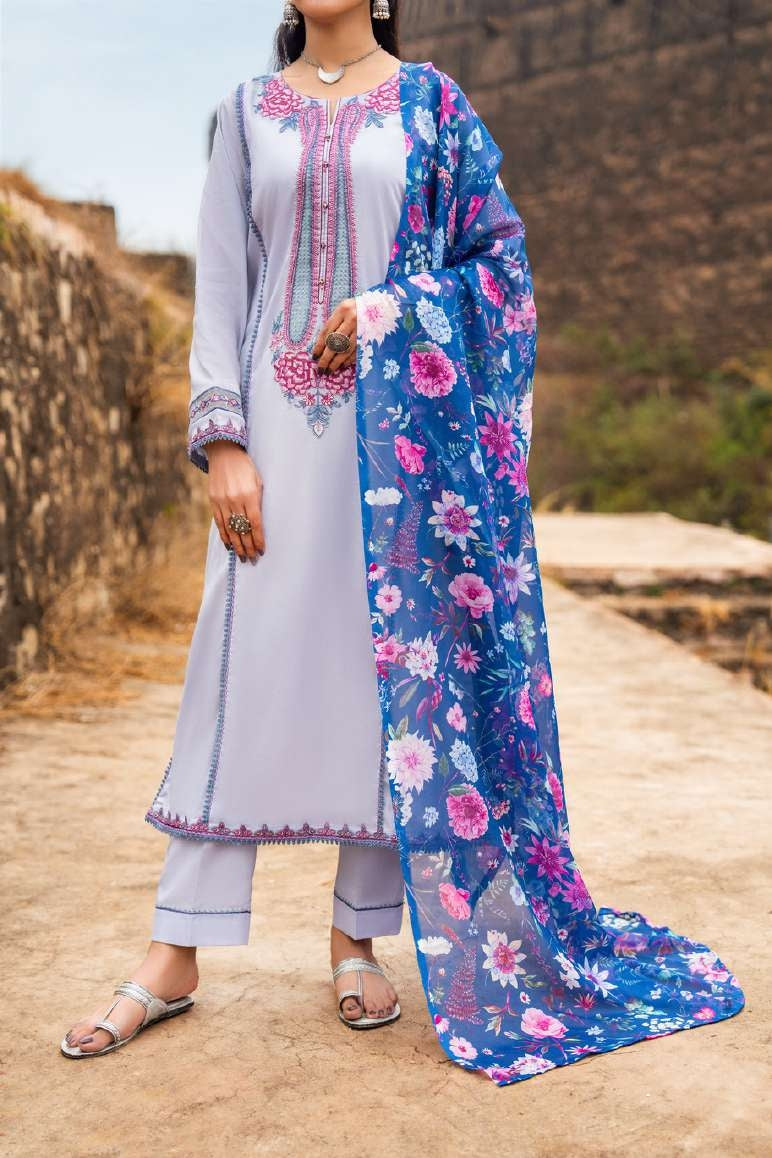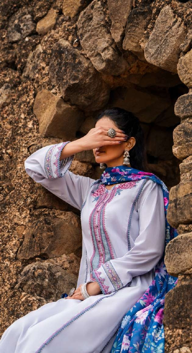 This soft lavender-hued kurta features intricate pink and blue embroidery along the neckline and borders, exuding a graceful and feminine charm. The straight-cut design is complemented by tailored trousers with delicate detailing at the hem. The ensemble is completed with a lightweight, matching dupatta that drapes effortlessly, adding an ethereal charm. The highlight of the outfit is the vibrant, floral-printed chiffon dupatta in striking shades of blue and pink, adding a touch of elegance and contrast.