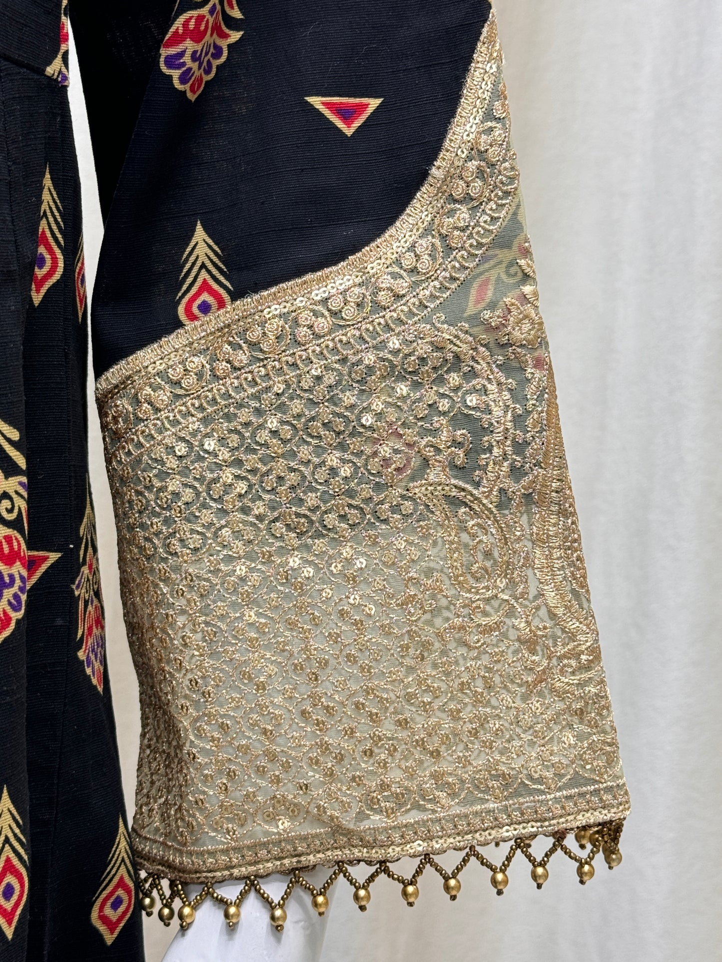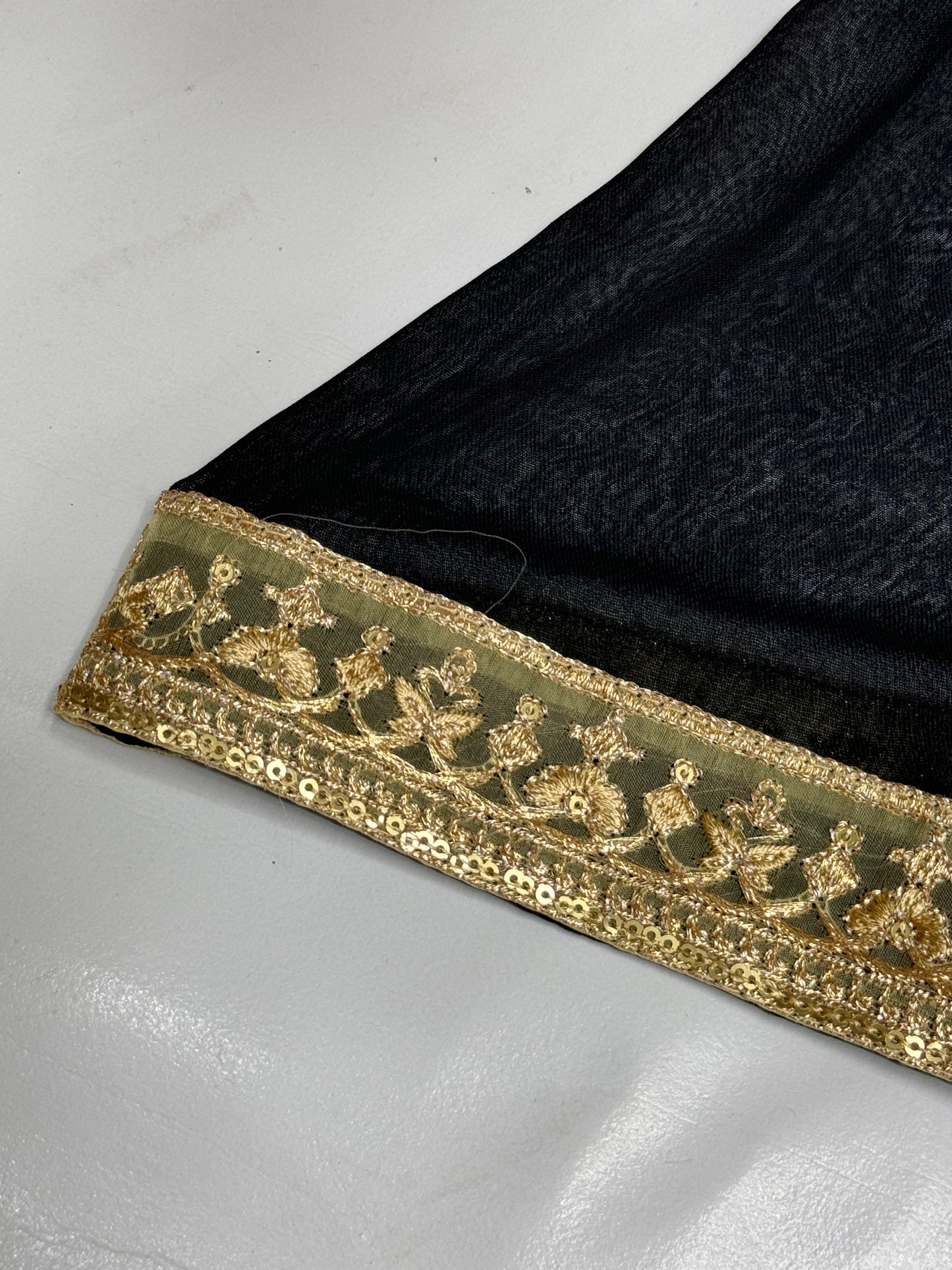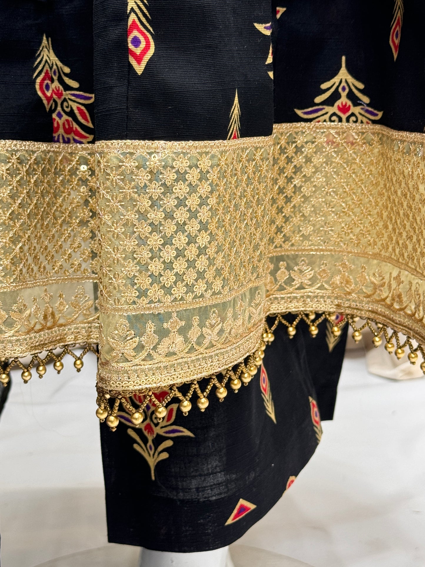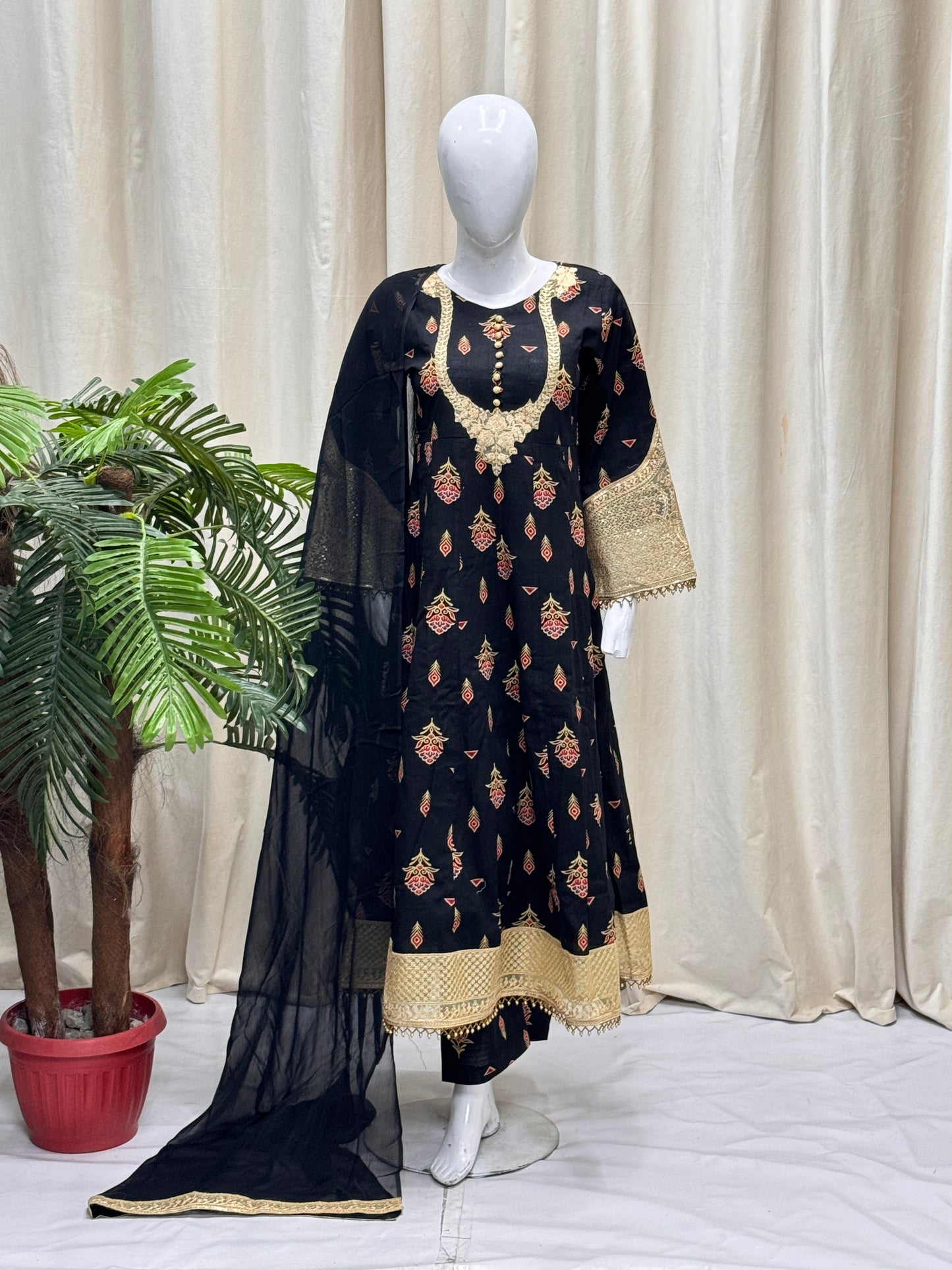 Indulge in luxury with our Soft Petals in Black 3PC READY TO WEAR set. Made with exquisite Khaddar fabric, this set includes a frock, trouser, and chiffon dupatta for a complete and stylish look. Perfect for any occasion, elevate your wardrobe with this aspirational and vivid ensemble.