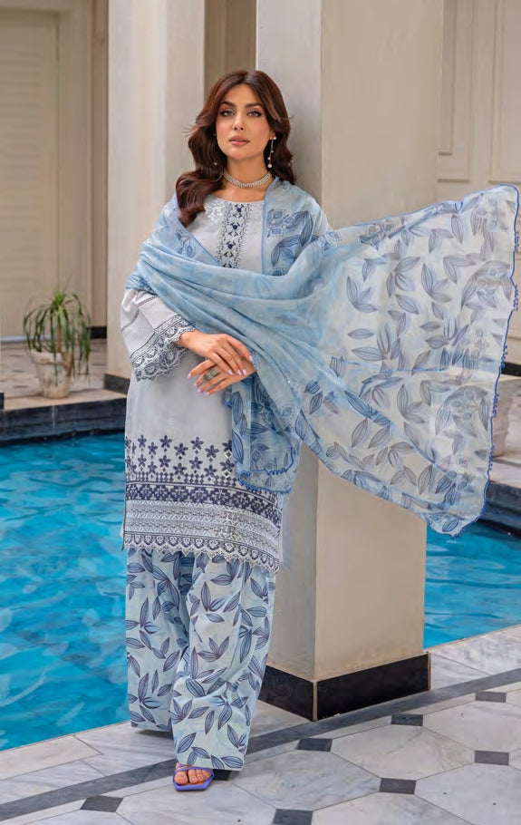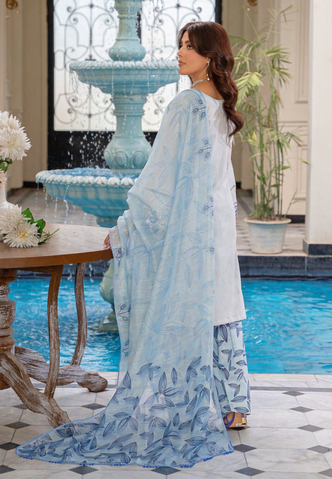 Discover the perfect look. Its intriguing details make it a must-have for any wardrobe. Designed for comfort and style, you'll feel confident and fashionable every time you wear it. Upgrade your look today with this outfit. This luxurious 3PC ensemble showcases exquisite cotton lawn enhanced with intricate thread embroidery, paired beautifully with a printed dupatta. The statement Farshi shalwar brings a timeless traditional flair, complemented by lace accents and a striking contrast for elevated elegance.