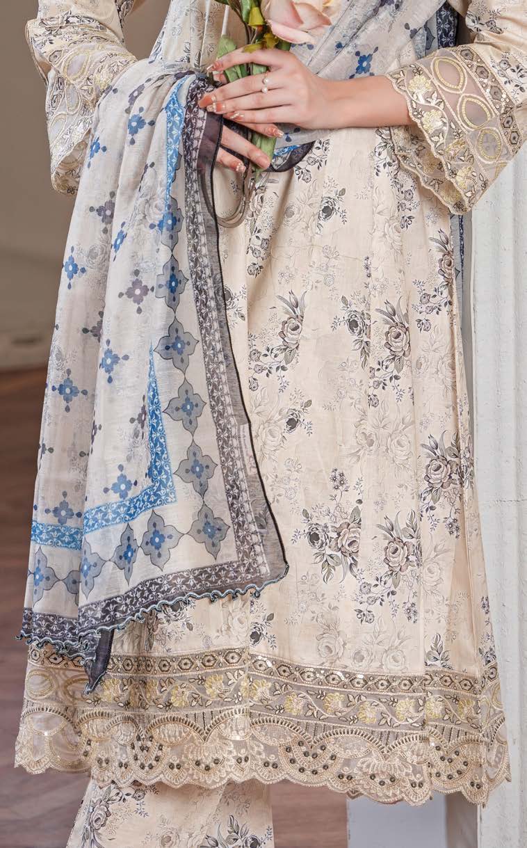 Expertly crafted with 3 pieces - Frock, Dupatta, and Trouser - all ready to wear. Made with high-quality Lawn and Cotton fabrics, adorned with elegant embroidered patch work and lace details. Complete your look with this beautiful Soni Zaml collection.