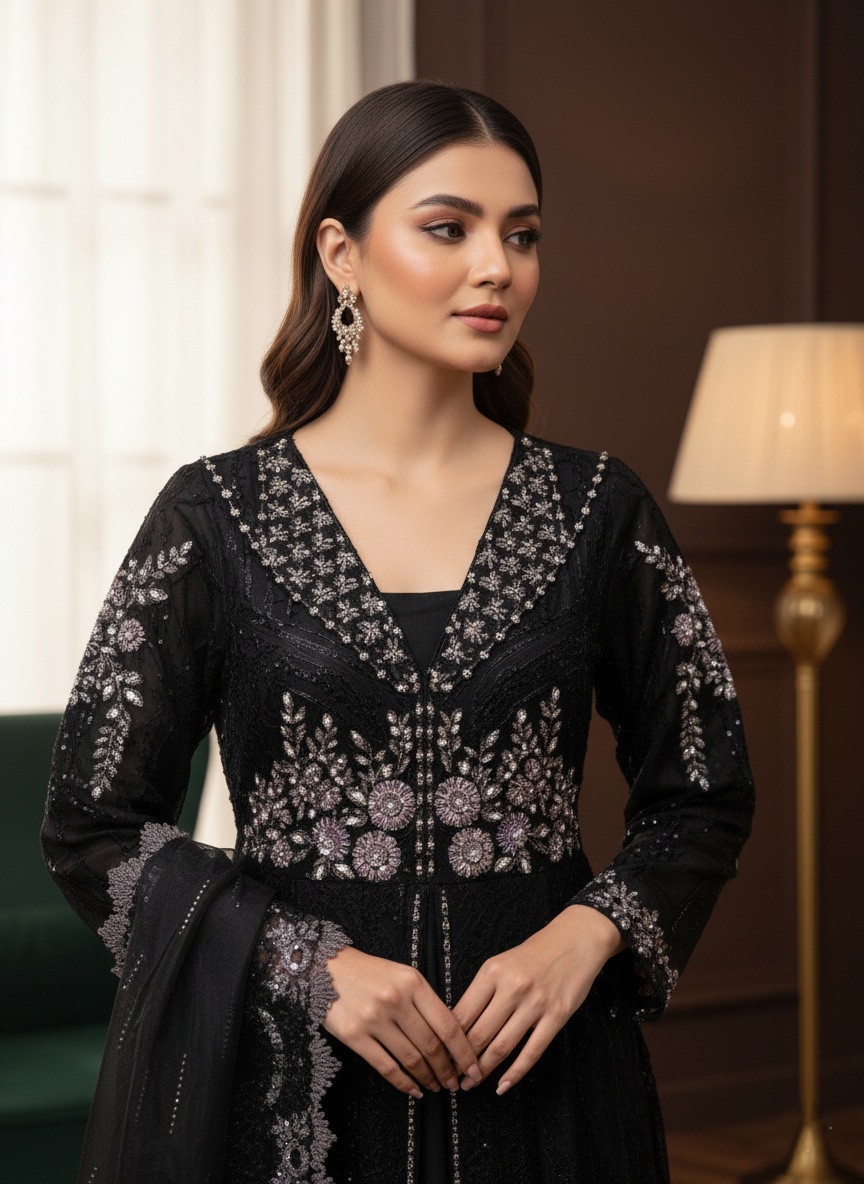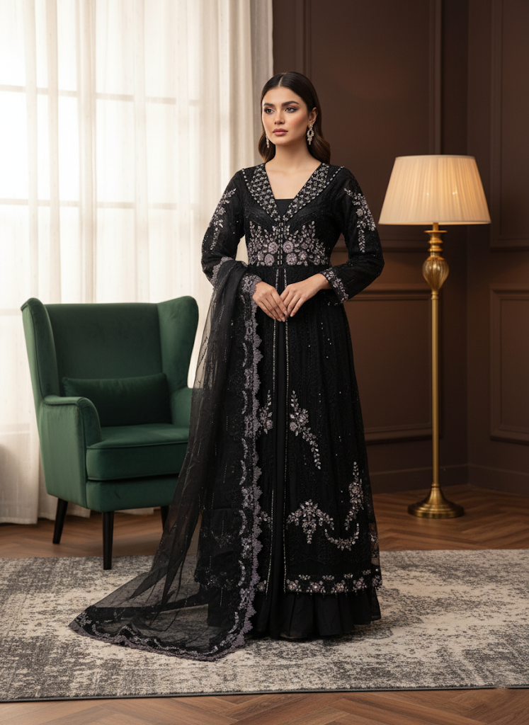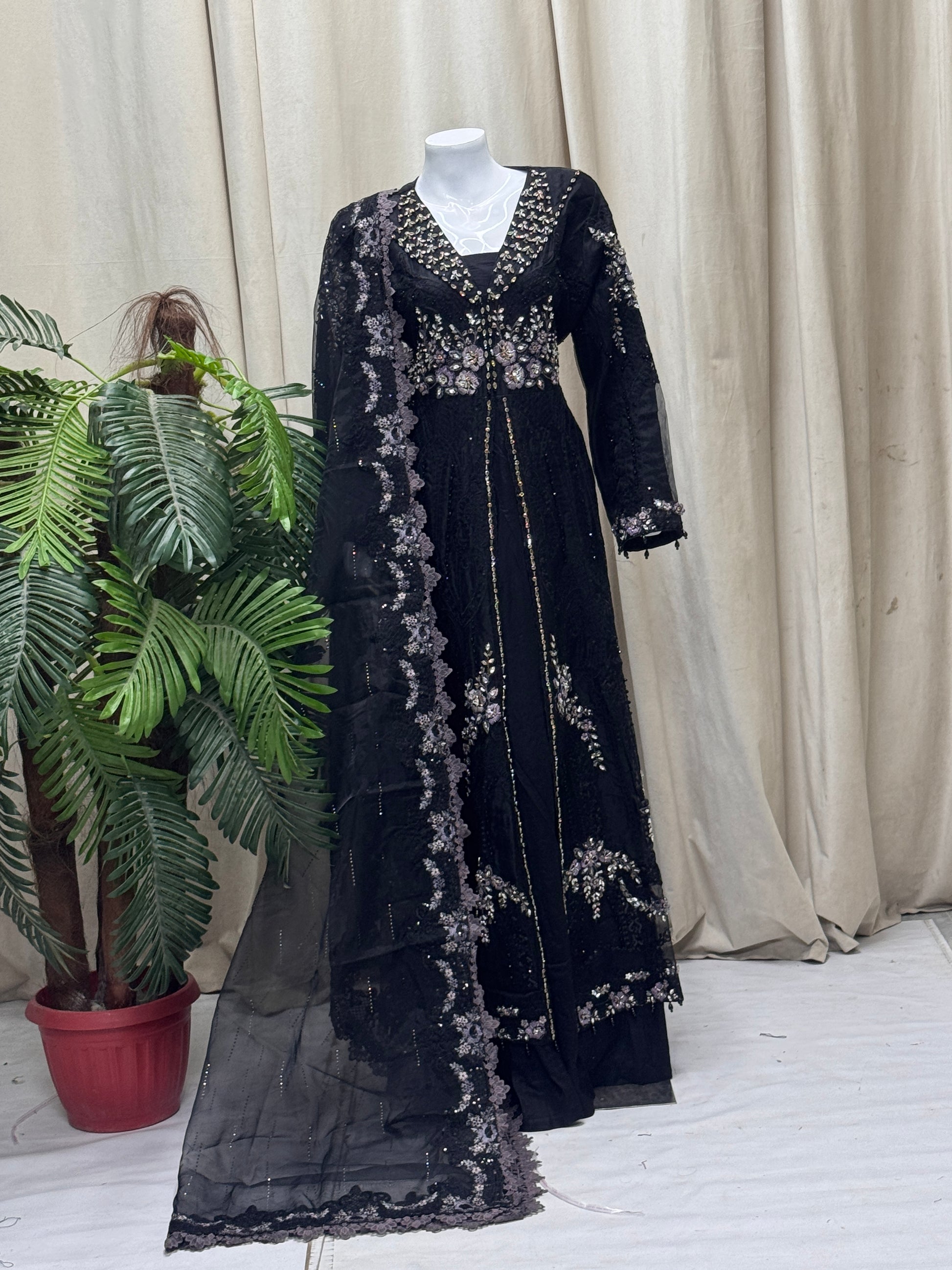 An organza open long frock that flows with grace, detailed to bring out a refined silhouette. Paired with sleek viscose trousers for comfort and balance, and a matching organza dupatta that completes the ensemble with sophistication—perfect for festive occasions.