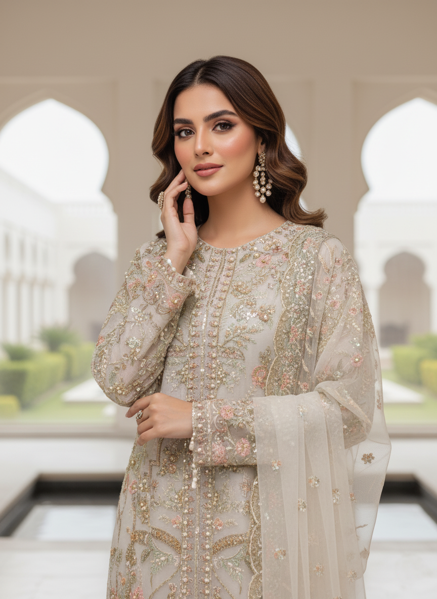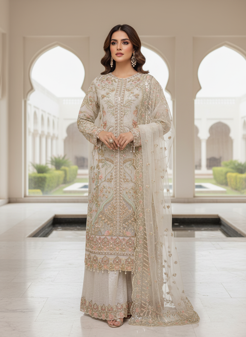 A net long shirt adorned with delicate embroidery, paired with a masuri sharara that brings timeless elegance. The organza dupatta adds a graceful finishing touch, making this ensemble perfect for festive occasions and wedding celebrations.