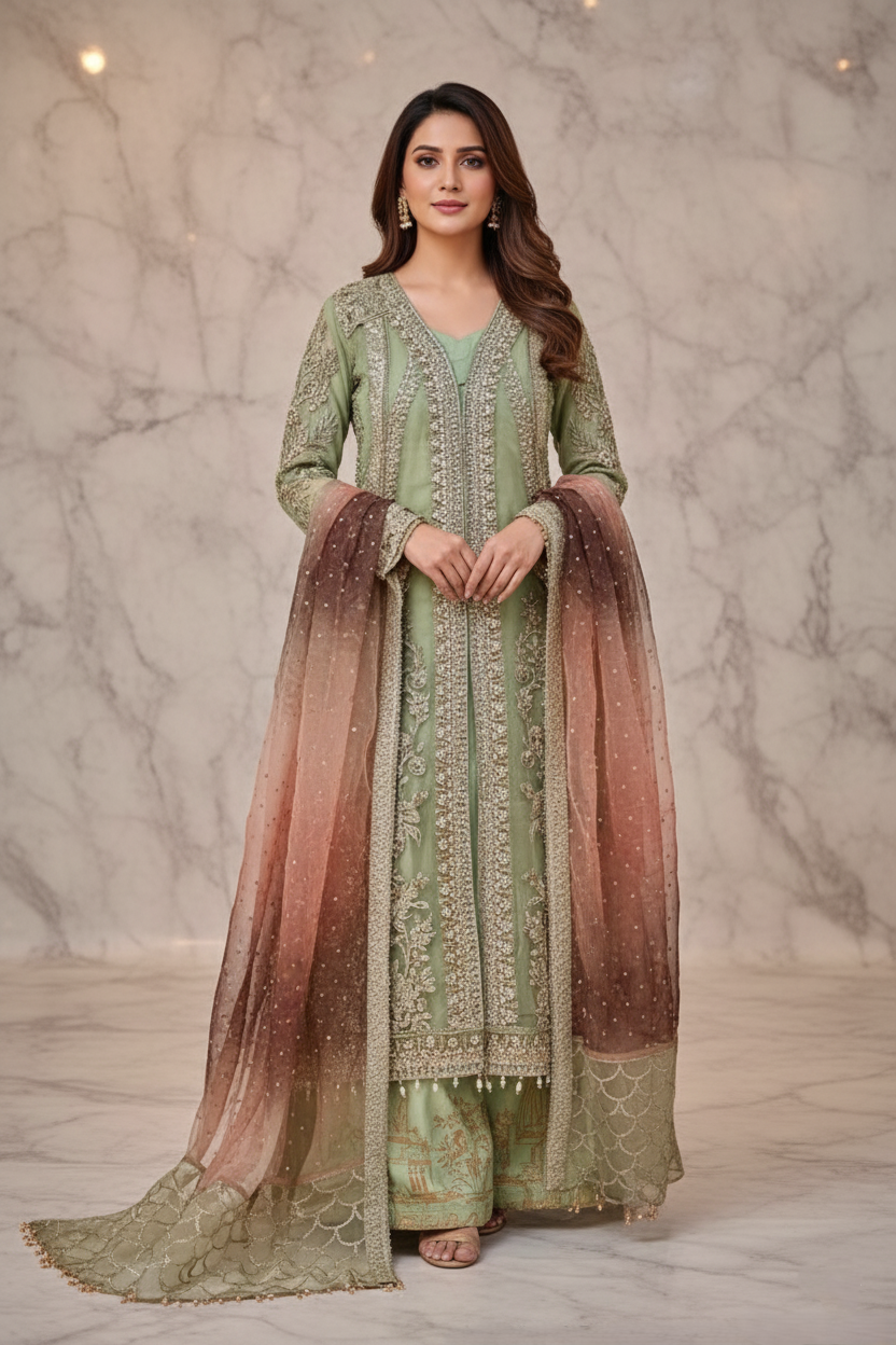 An organza shirt beautifully detailed with tilla, sequins, and pearl work, making it perfect for refined gatherings. Paired with a viscose flapper featuring artistic block printing for a statement look, while the digital printed dupatta adds a modern, vibrant touch to the ensemble.