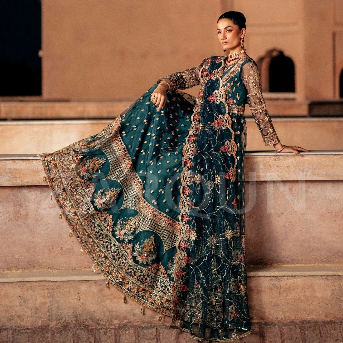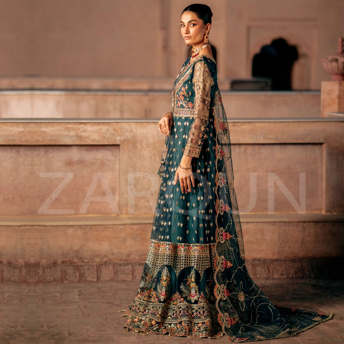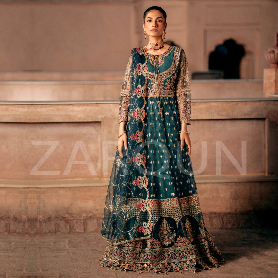 Meticulously handcrafted floor length frock featuring a cascading flared look and cut from the premium quality Net fabric in beautiful shades of misty teal. Neckline, Sleeves and yoke are heavily Embroidered and Embellished with pearls, Naqshi, Cora, Dabka, Gota Handwork. This Floor Length Maxi outfit is a perfect choice for an upcoming Mehndi/Mayon wedding event.