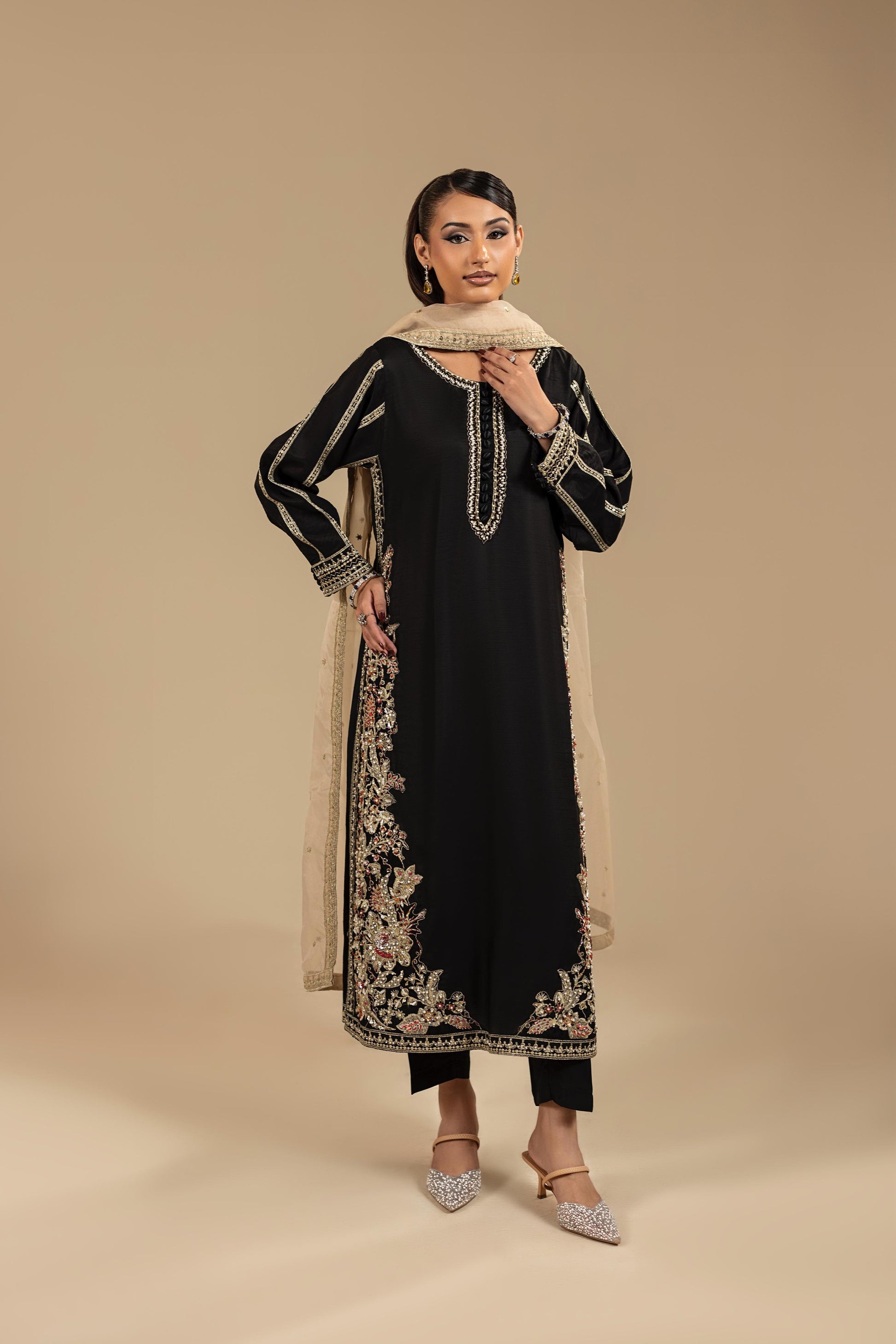 Experience the ultimate elegance and spiciness. Designed by Naqsh Collection, this 3-piece ready to wear ensemble includes a long shirt, trouser, and dupatta made of luxurious Korean raw silk and organza. Perfect for any occasion, add a touch of sophistication to your wardrobe with this stunning outfit. Design by Naqsh Collection