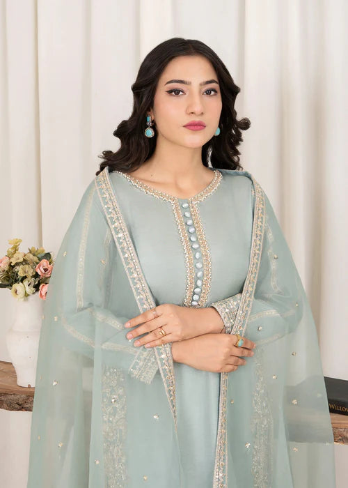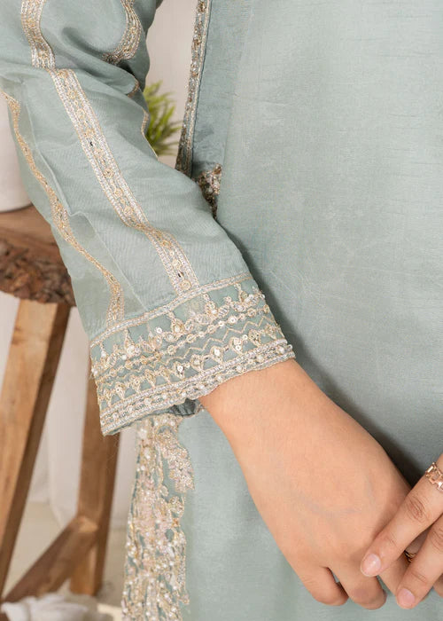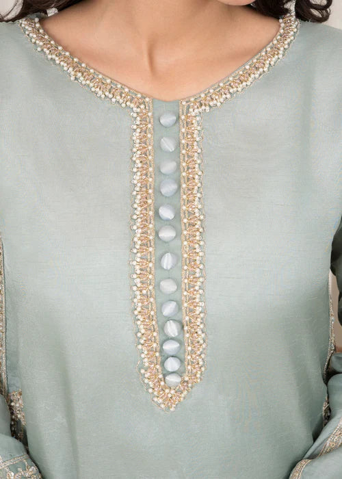 Experience the ultimate elegance and spiciness. Designed by Naqsh Collection, this 3-piece ready to wear ensemble includes a long shirt, trouser, and dupatta made of luxurious Korean raw silk and organza. Perfect for any occasion, add a touch of sophistication to your wardrobe with this stunning outfit. Design by Naqsh Collection