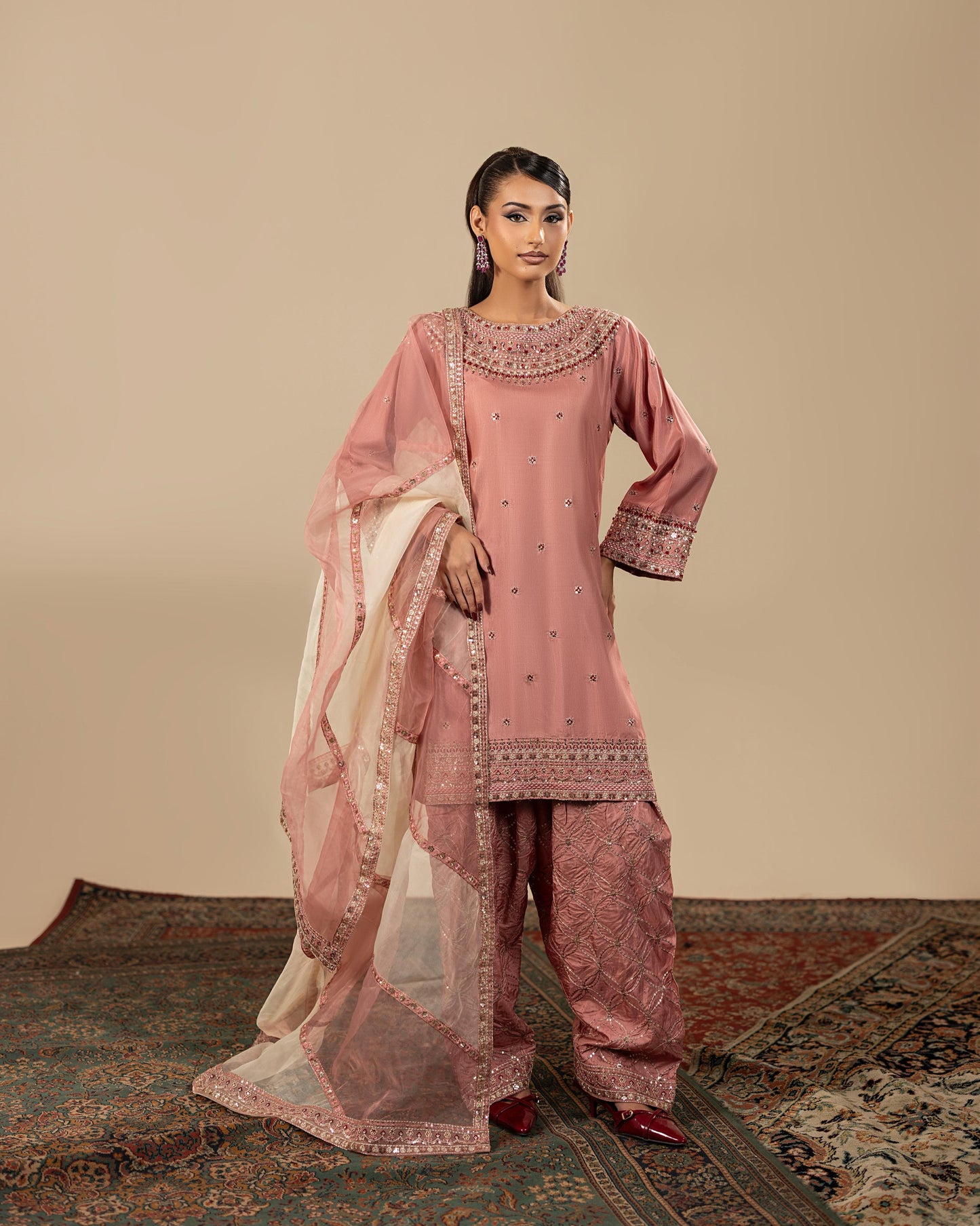 Discover the perfect look. Its intriguing details make it a must-have for any wardrobe. Designed for comfort and style, you'll feel confident and fashionable every time you wear it. Upgrade your look today with this outfit. This graceful 3PC ensemble features a rawsilk short shirt paired with a matching rawsilk farshi shalwar, creating a rich, elegant base. The organza dupatta adds a delicate, airy touch — making it perfect for festive occasions and formal gatherings.