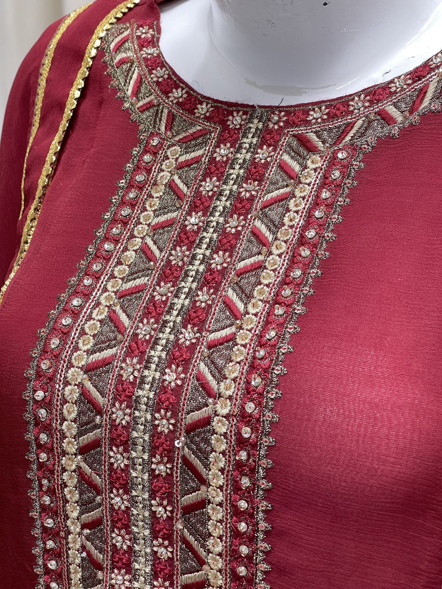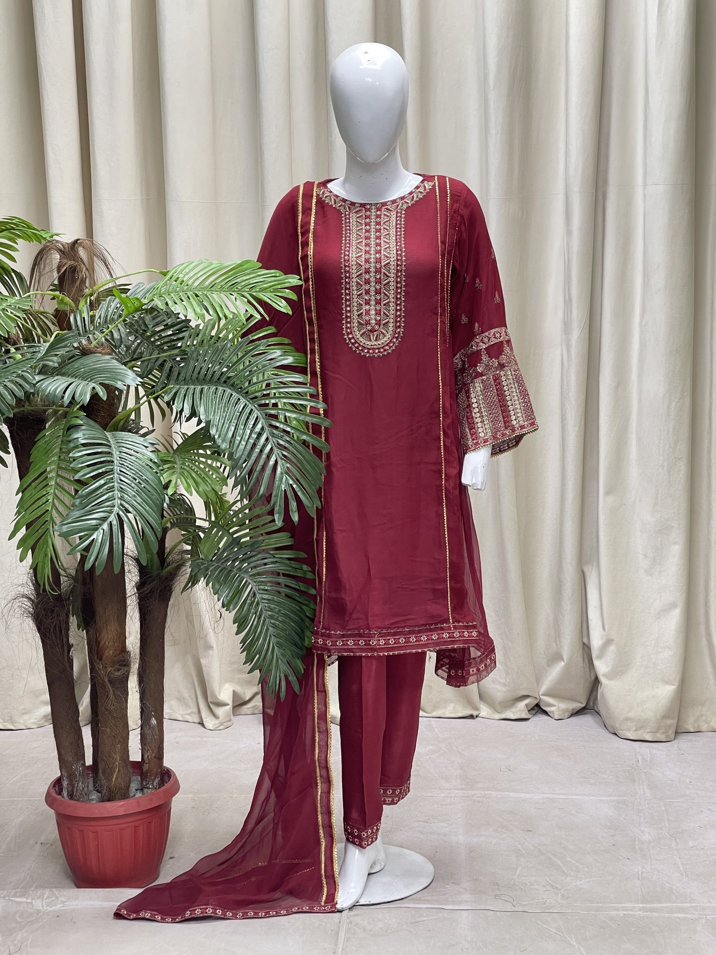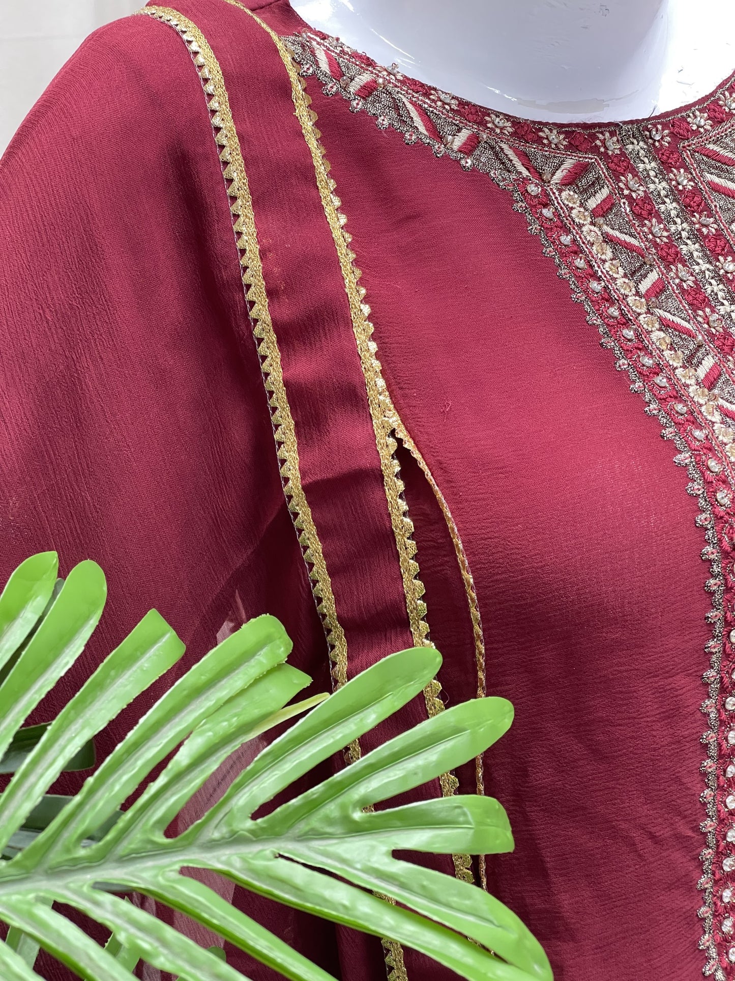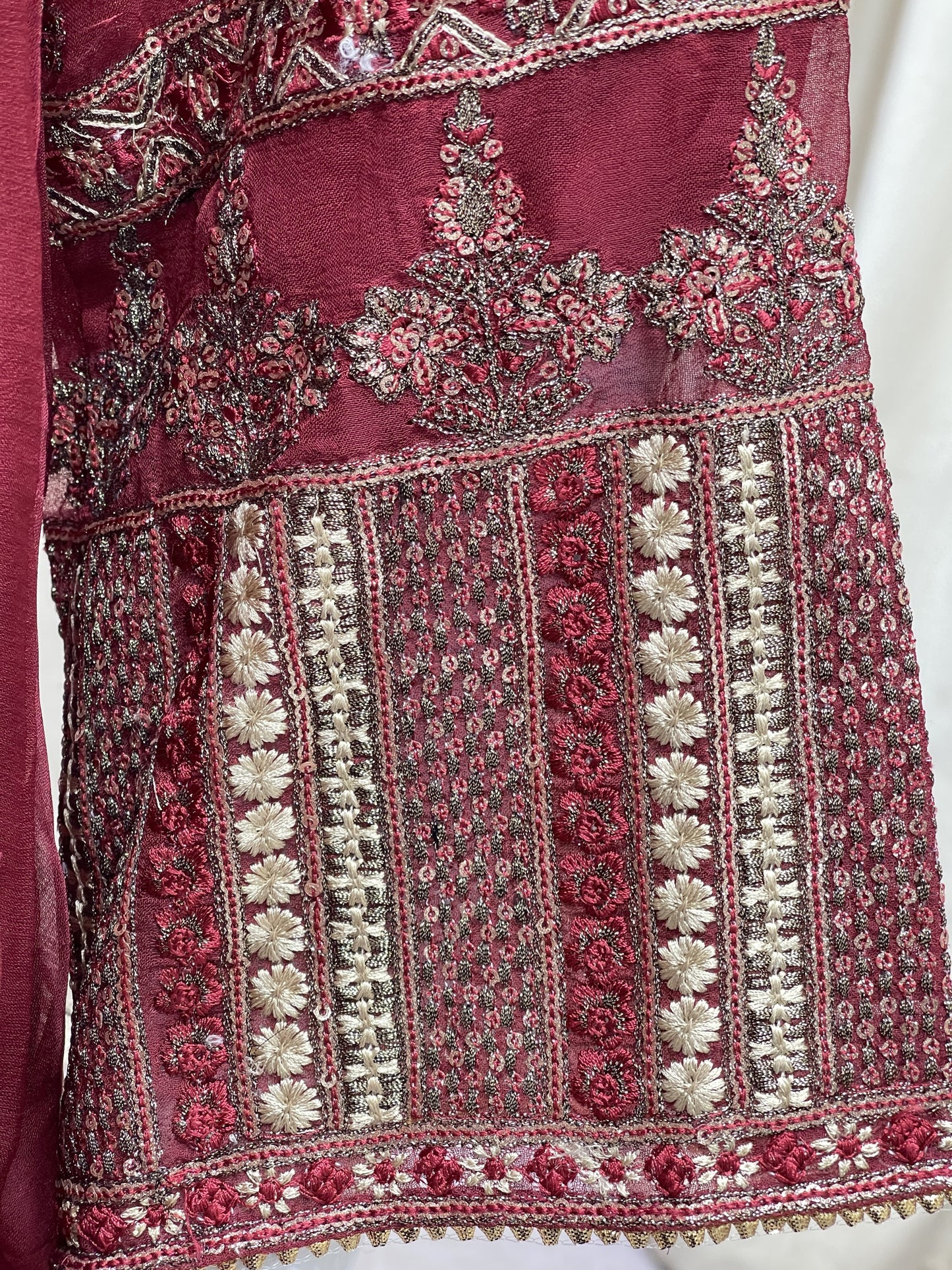 Be the center of attention in the stunning By SH outfit. This 3PC Ready To Wear set includes a beautiful chiffon frock, a matching chiffon dupatta, and a comfortable grip trouser. Perfect for any occasion, this set will make you feel elegant and stylish.