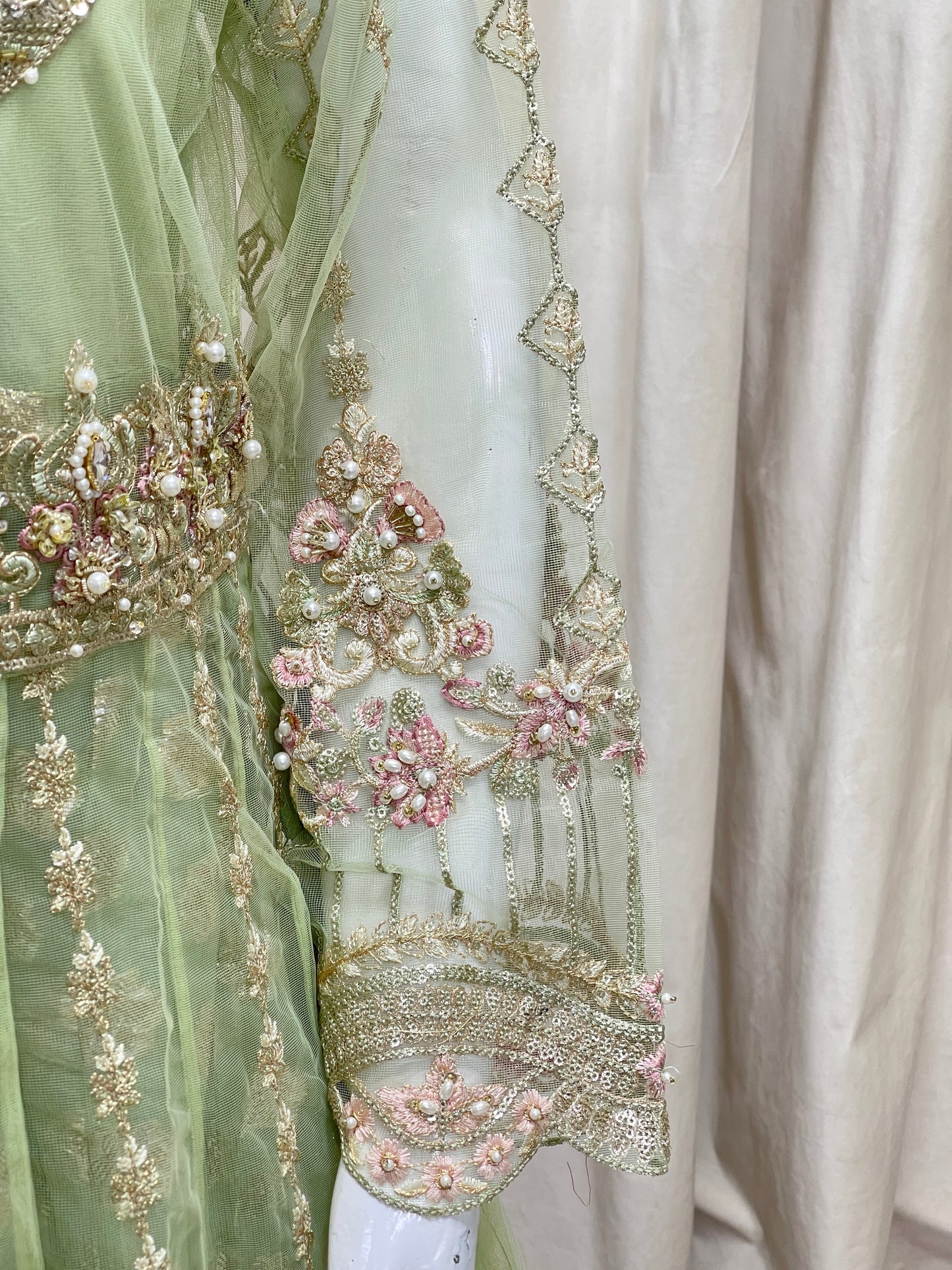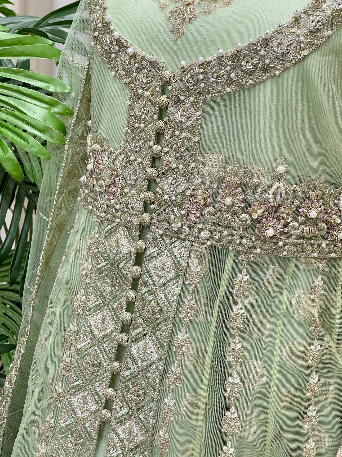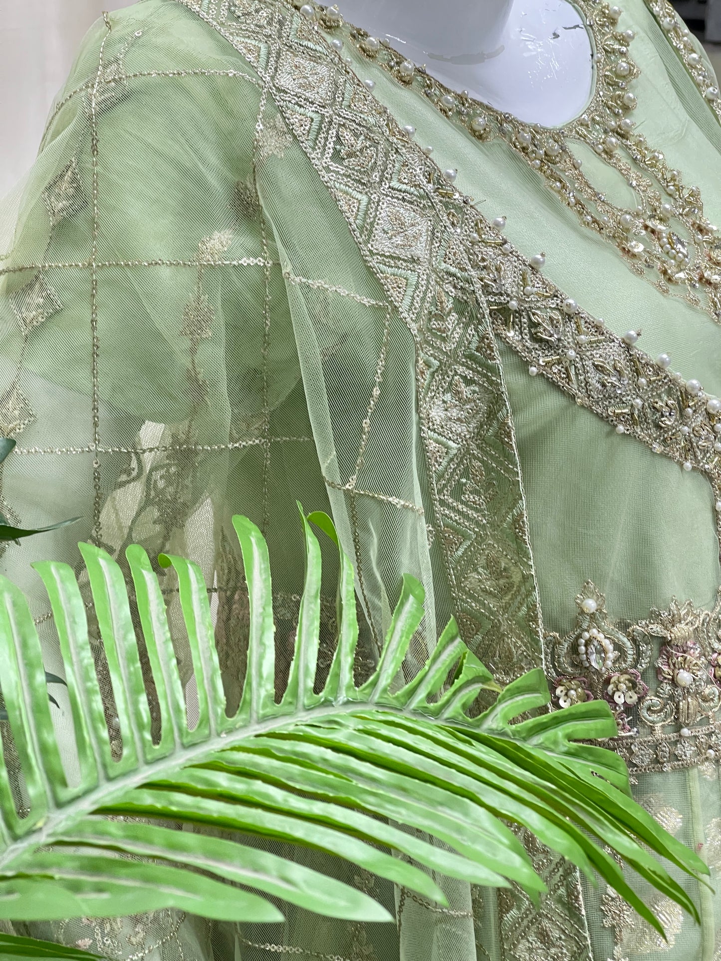 Get ready to turn heads in our stunning ZR 2339 3PC Ready To Wear ensemble! This set includes a flowing Net Gown, elegant Broshia Organza Inner, and comfortable Grip Trouser, all topped off with a Net Dupatta. Perfect for any occasion, this outfit will make you feel confident and stylish.