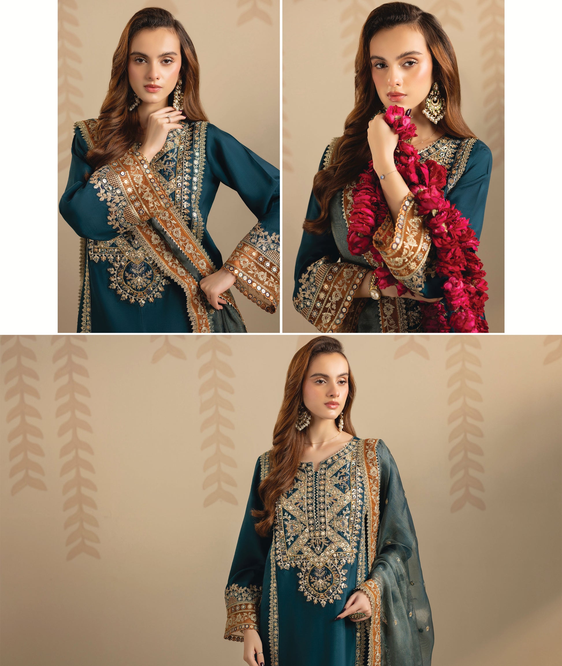 A luxurious silk three-piece ensemble that embodies timeless elegance and sophistication. The soft silk fabric drapes beautifully, creating a graceful and polished look—perfect for festive gatherings or formal occasions.